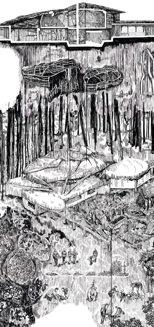 9.1, 9.23–9.26 Yingqi (Izzy) Shen, Y3 ‘The Supernatural’. The proposal questions the symbiotic relationship between humans and nature, and asks to what extent a building can be ‘supernatural’. It uses Tegel, Berlin, as a testbed to explore innovative timber construction methods with the assistance of augmented reality technology. The data collected by the project will be fed into the 2050 Tegel Airport vision to create a sustainable transport hub for Berlin’s future.