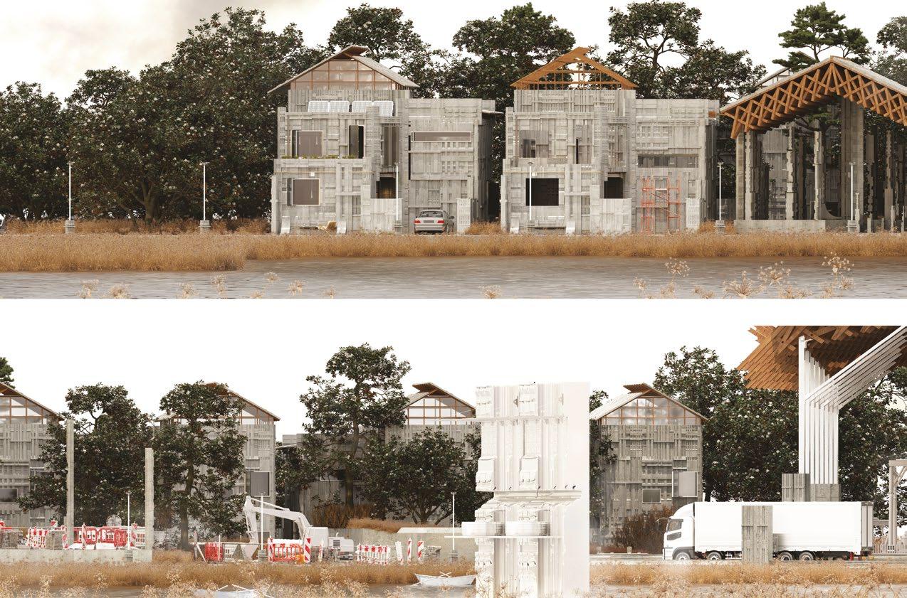 9.1, 9.22–9.25 Yaowen Zhang, Y3 ‘Land, Building and Dwelling’. This project develops and tests experimental construction methodologies for housing in the context of Martin Heidegger’s concept of learning to ‘dwell’. Sited in Rotterdam, the project begins with detailed analyses of the local marine clay deposits and proposes innovative modular construction techniques using these local materials. On a local scale, the scheme develops continuous interaction between building, land and resident. Ultimately, traditional ‘linear’ models of construction are replaced by a series of circular processes that feed into a masterplan comprising factory, landscape and housing units.