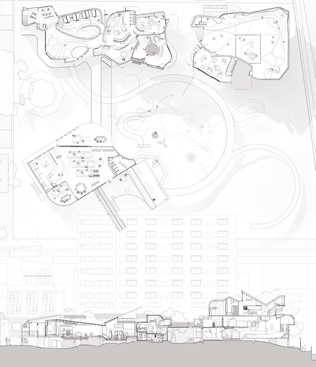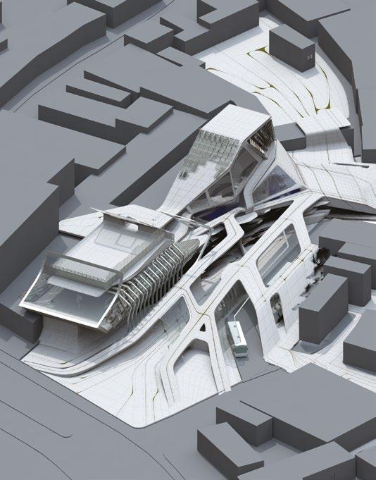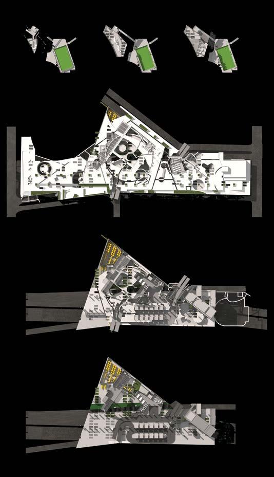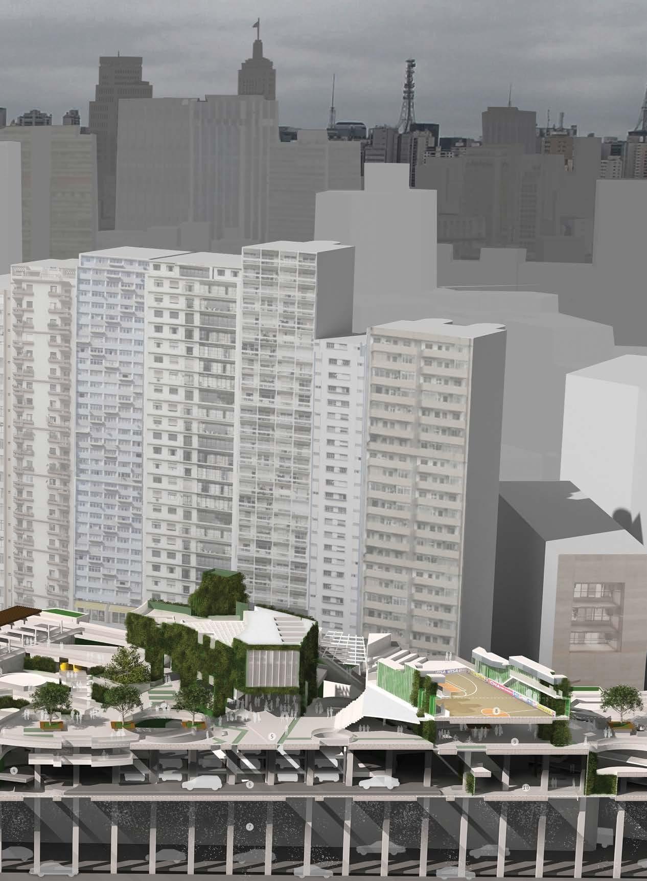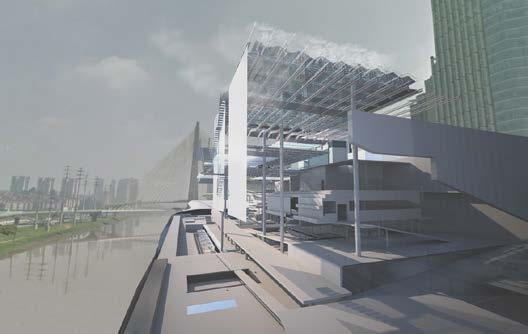 through the filtration of the river water and introduction of an artificial ecosystem, which creates an urban oasis landscape along the riverside.The site is on the edge of the main river, where three underground sub-rivers meet. The built-over rivers in São Paulo cause many problems due to the lack of soil exposure and high rainfall, which results in many areas being flooded. Fig. 9.3 Hao Han, Y2, Mal Deldoro Bus Terminal and Market Exchange. The scheme is for a public bus terminal and exchange market. The programme is a response to the social fragmentation and poor transport system in the northwestern part of São Paulo. It is designed around local bus destinations, demographics and time cycles throughout the day.
