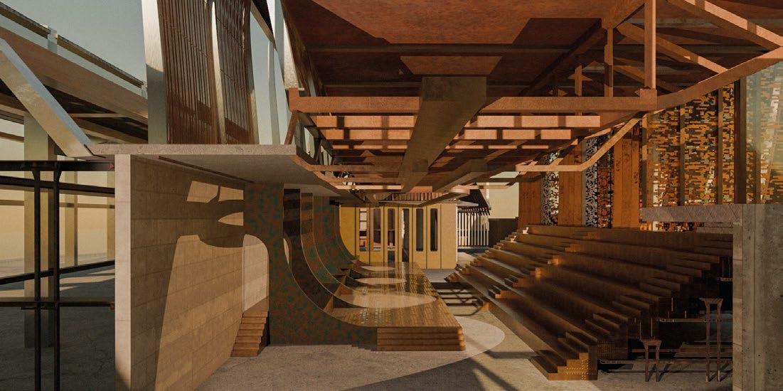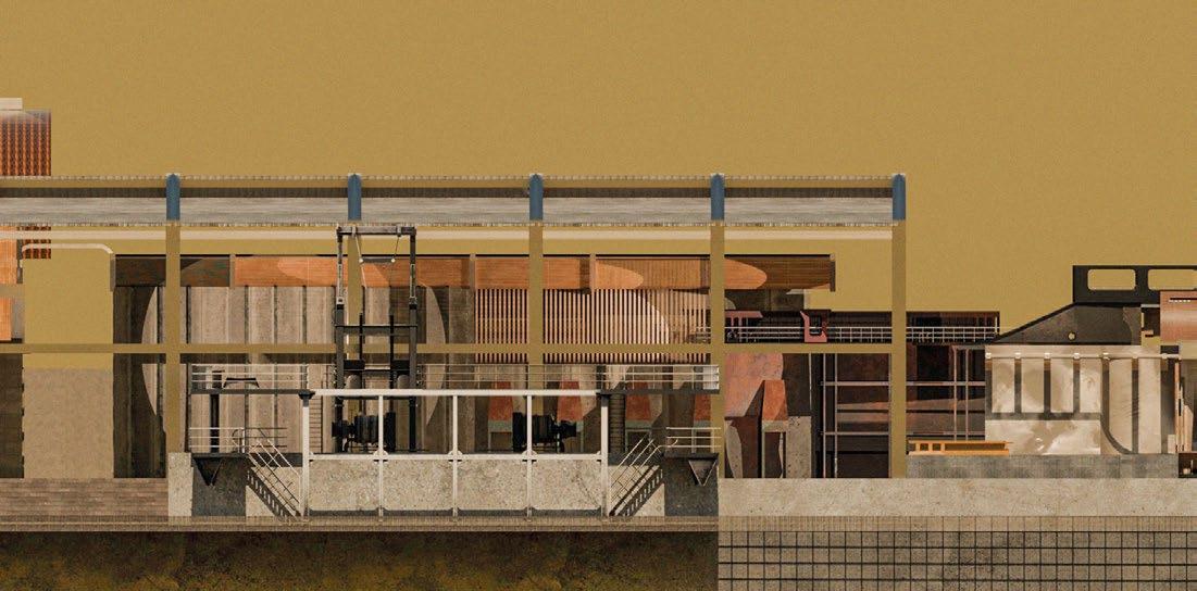 9.2–9.4 Lihui (Lily) Lin, Y3 ‘The Ship Spolia Performance Art Theatre’. Situated in Delfshaven, Rotterdam, this communal theatre involves the retrofitting of the shipyard and dock along the Nieuwe Maas River. The project proposes the concept of ‘metal spolia’, which develops a continuous cycle of dismantling and assembling metals that once operated as ship components and now serve as building structures on site. Simultaneously, the building acts as a testing ground for the phenomena of metal deterioration, fatigue and rusting, embracing construction techniques that extend the material lifespan.