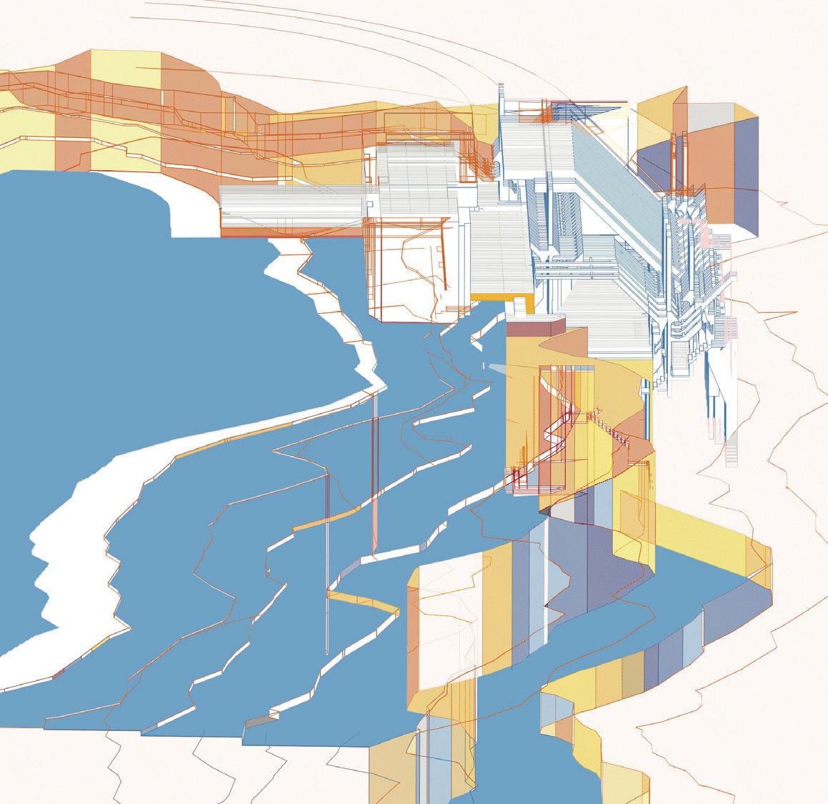 9.7–9.9 Libby Ko, Y3 ‘The Water Experience Centre’. Embedded on the riverbank in Rotterdam, this centre blends into the city’s distinctive hardscape. Its curved form and sunken profile soften the urban landscape, creating a natural integration with the surrounding environment. Water takes centre stage, domesticated and made visible through the design, transforming public perception by revealing hidden infrastructure and various water conditions through a series of time-regulated water clock courtyards.