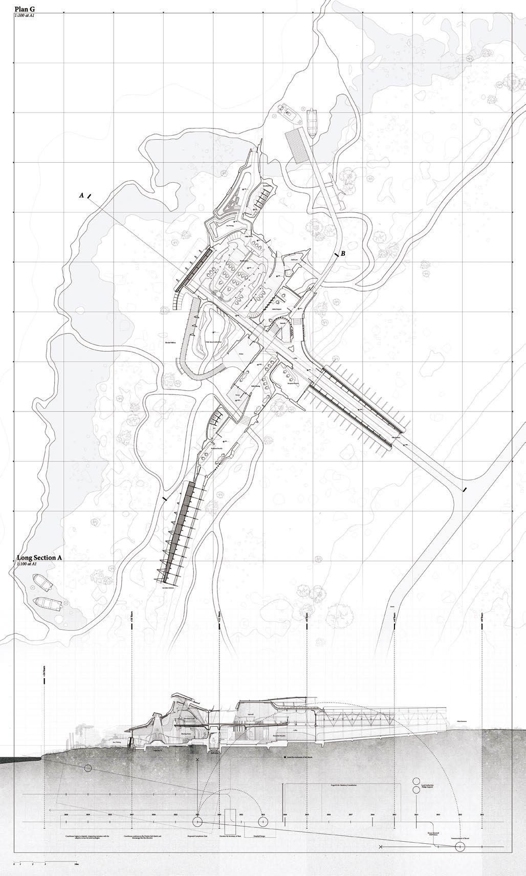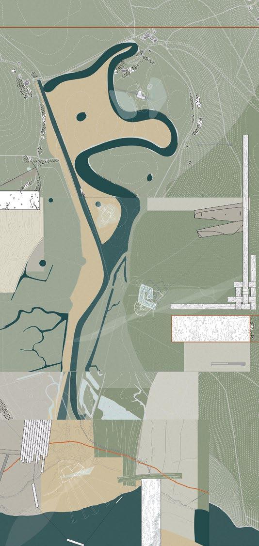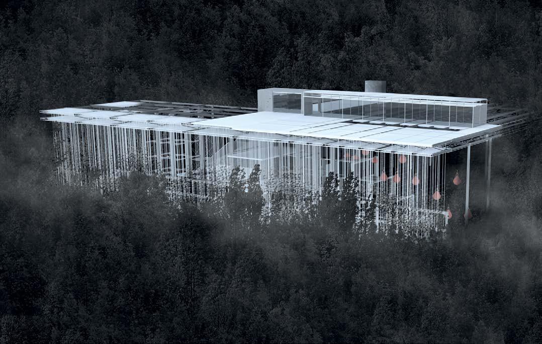 9.6 Kai Pentecost, Y2 ‘The Loophole Cemetery’. The proposal provides a legal loophole, allowing ashes to be scattered back into German nature via a connection to the River Spree which runs through Berlin. 9.8–9.9 Sean Ow, Y2 ‘The Cloud Agenda’. Nestled on the eastern riverbank of Plänterwald, a forest in south-east Berlin, the Cloud Agenda offers a solution to the city’s water shortage crisis. Conceptualised as a performative ecosystem, the research centre is an architectural testbed for urban cloud seeding operations, merging ecological principles of the biotic pump with marvels of hygroscopic cloud-seeding technology to conceive an architecture that actively restores the climate and in turn constructs its own microclimate.