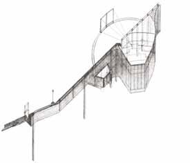 Fig. 9.16 Gary Edwards, CAFA Union. See Fig. 17 for more details. Perspective plan view. Fig. 9.17 Gary Edwards, CAFA Union. The project proposes a student union in addressing issues of communication and democracy. Sited in the China Central Academy of Fine Arts, the building adjusts and adapts to signify and cater for a range of sporting and social events. The project addresses contemporary issues of the virtual and the real through an interactive architecture that utilises programming technology to adapt to the users’ needs. Sectional perspective view.