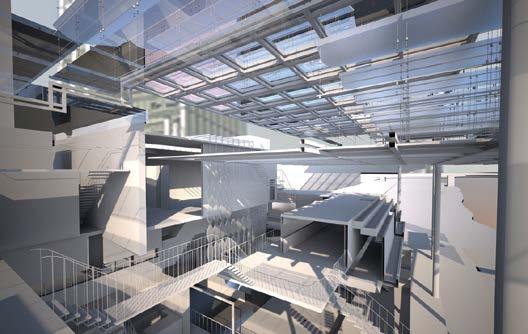 whilst the architectonics provide open platforms for more spontaneous events. Image shows detail of exploded CAD model in relation to the building’s grid as a system to divide the use of individual spaces.