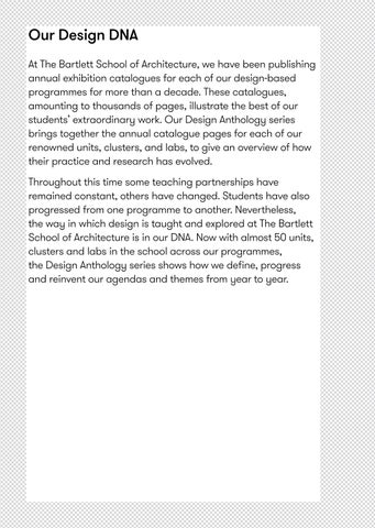 Throughout this time some teaching partnerships have remained constant, others have changed. Students have also progressed from one programme to another. Nevertheless, the way in which design is taught and explored at The Bartlett School of Architecture is in our DNA. Now with almost 50 units, clusters and labs in the school across our programmes, the Design Anthology series shows how we define, progress and reinvent our agendas and themes from year to year.