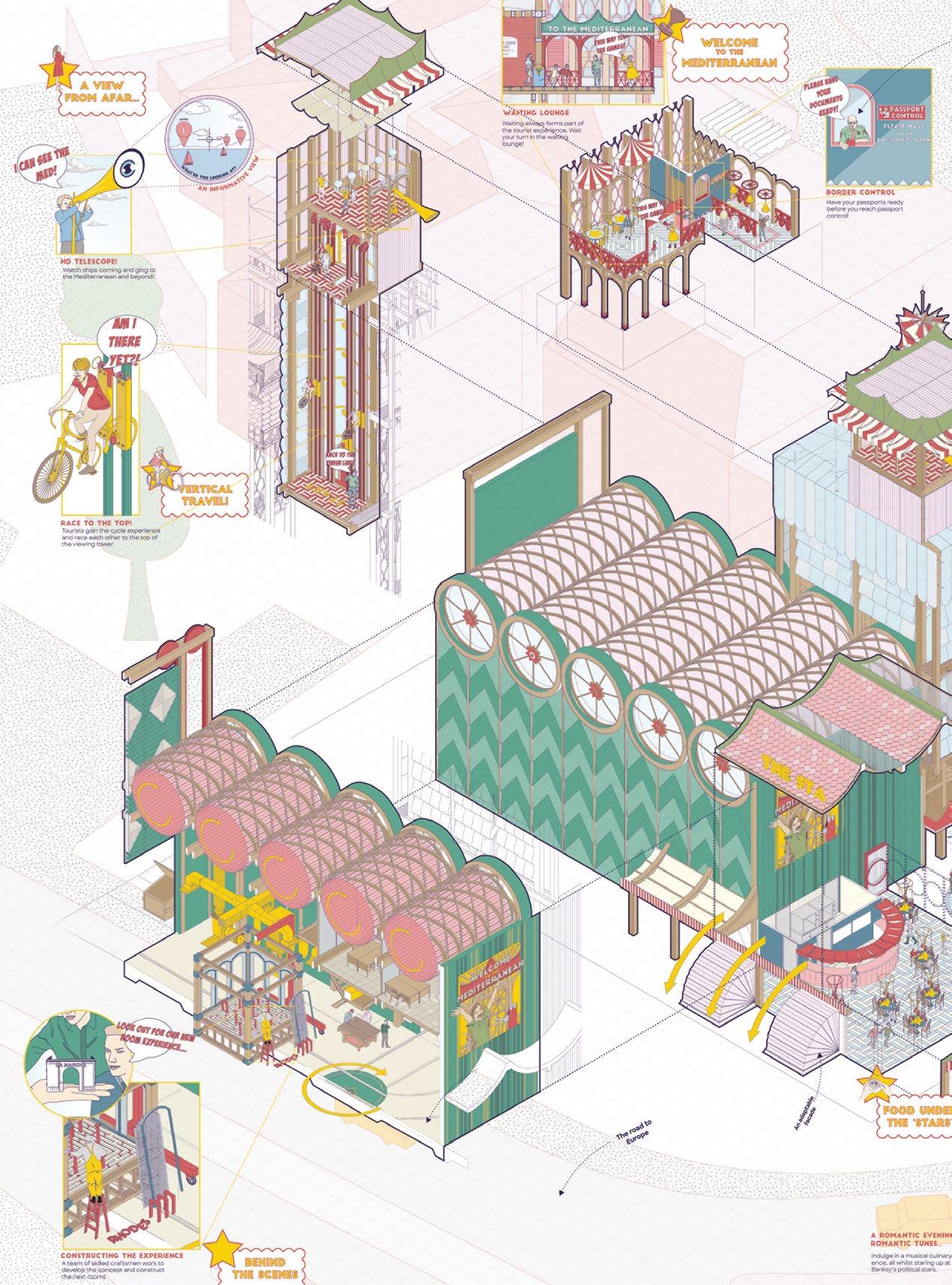 Figs. 22.12 – 22.13 Kirsty Williams, Y4, Theatre for traditional Indonesian shadow art, Wayang Kulit. Sited on the Citarum River, widely acknowledged as the most polluted river in the world, it also incorporates a water treatment centre. Fig. 22.14 Clarissa Yee, Y5, New Migrant Journeys, Sicily. A typology, to house migrant Tunisian agricultural workers in Sicily. The dwelling design draws upon Sicilian and Tunisian culture, each migrant worker is given a house, which is transported by lorries to agricultural lemon and almond picking sites, forming clusters of seasonal accommodation.