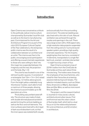 and acoustically from the surrounding environment. The external cladding was also lined with a thin skin of cork. Natural ventilation was achieved through the nozzles and openings in the roof. There was a large screen with a 16:9 aspect ratio, a high-resolution data projector suspended from the ceiling and a 5.1 surround sound speaker system, providing a high-quality cinematic experience. The ‘kit of parts’, weighing less than two tons, consisted of 14 elements, transported on a single flatbed truck, erected – and later dismantled – in eight hours by a team of four. Open Cinema screened a loop of 23 film trailers from the CineClube de Guimarães archive, each about three minutes long. The trailers were chosen by the employees of two local factories, who voted for their favourites at screening sessions held during lunch breaks. The selection included classics, such as Citizen Kane, Amarcord, Le Mépris, Apocalypse Now and Star Wars, as well as more recent films like Shrek. The project, and the research behind it, touched on many social, cultural, architectural and urban issues. First and foremost was the urban culture of Guimarães itself, which led to a dual focus on (a) the relationship between film and architecture, and (b) emotion in architecture.