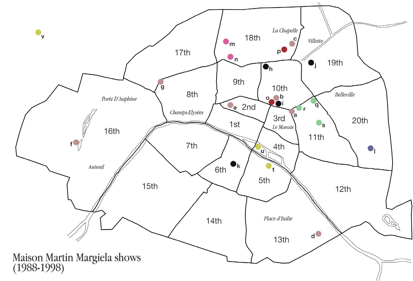 Looking at the mapped shows, several stand out for their peripheral locations in contrast to the centrality of the first arrondissement, where Paris Fashion Week traditionally unfolds. The Autumn-Winter 1995–1996 show, for instance, was held under a circus tent in the Bois de Boulogne, west of the city. The physical travel induced by this offbeat location challenged the usual comfort and proximity enjoyed by fashion professionals. At the Maison, codes were often subverted through symbolic inversion. Similarly, after a journalist remarked that the clothes resembled those found in a charity shop, the Maison staged its next show at the Salvation Army headquarters. Of particular interest is the notoriety of the building itself — designed by Le Corbusier in 1933 — yet the Maison made no reference to the architectural landmark. Instead, the focus shifted to what the space represented.