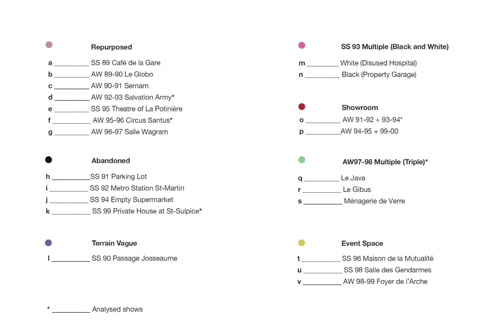By compiling information from the twenty shows of the Maison’s first decade, I was able to map the presentations across Paris and create a corresponding table. (fig.1-2) This process revealed patterns and led to a typology of venue categories: repurposed, abandoned, terrain vague, multiple, showroom,