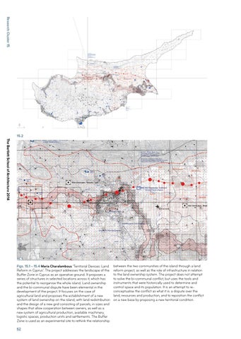 Research Cluster 15 15.2 The Bartlett School of Architecture 2014 15.3 Figs. 15.1 – 15.4 Maria Charalambous ‘Territorial Devices: Land Reform in Cyprus’. The project addresses the landscape of the Buffer Zone in Cyprus as an operative ground. It proposes a series of structures in selected locations across it, which has the potential to reorganise the whole island. Land ownership and the bi-communal dispute have been elemental in the development of the project. It focuses on the case of agricultural land and proposes the establishment of a new system of land ownership on the island, with land redistribution and the design of a new grid consisting of parcels, in sizes and shapes that allow cooperation between owners, as well as a new system of agricultural production, available machinery, logistic spaces, production units and settlements. The Buffer Zone is used as an experimental site to rethink the relationship 62