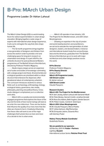 MArch UD operates in two streams, UDI: The Project for the Mediterranean, and UDII: Urban Morphogenesis. Drawing on expertise in the city of London and world-leading teachers and practitioners, we set out to educate the next generation of urban designers, leaders, and decisionmakers. A diverse and international student body from across Europe, Asia and the Americas, graduates from The Bartlett School of Architecture go on to work with major architecture and urban design practices across the world. B-Pro Director Professor Frédéric Migayrou B-Pro Deputy Director Andrew Porter MArch UD Programme Leader, UDI Stream Leader Dr Adrian Lahoud UDII Stream Leader Claudia Pasquero Research Clusters MArch UDI: The Project for the Mediterranean RC11: Sam Jacoby, Adrian Lahoud with Samaneh Moafi RC12: Peter Besley, Hannah Corlett, Jonathan Kendall RC14: Ross Exo Adams, Beth Hughes, Davide Sacconi RC15: Platon Issaias, Camila E. Sotomayor MArch UDII: Urban Morphogenesis RC16: Claudia Pasquero, Marco Poletto RC17: Ulrika Karlsson, Maj Plemenitas RC18: Enriqueta Llabres, Eduardo Rico with Zachary Fluker History Theory Module Coordinator Godofredo Pereira We are grateful to our sponsors UD Bursary 2013-14: Foster + Partners Lighting: iGuzzini International Lecture Series: Fletcher Priest Trust