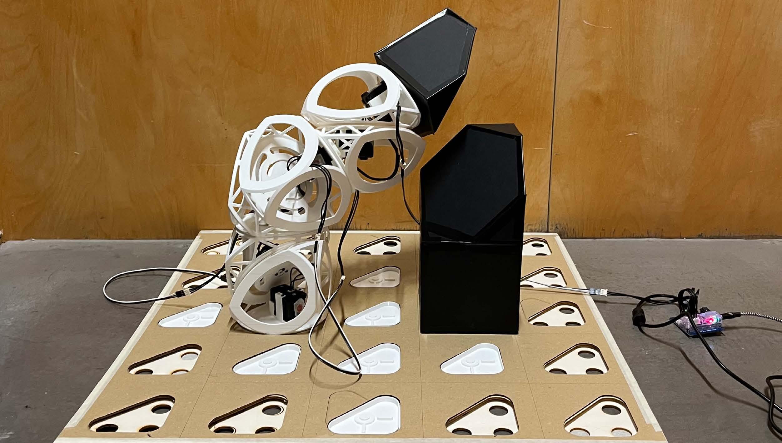 flexi is a novel system that merges robotics with elastic materials to create a dynamic, shapemorphing structure capable of responding to and generating sound while interacting with humans. By strategically integrating robotic joints within elastic materials, flexi can autonomously form and transform architectural bending-active gridshell structures with minimal energy. this project delves into the core design and control strategies governing the system’s behavior, as well as interaction techniques. embedded within a cyber-physical control system, flexi operates in real time, responding to human and sound parameters.flexi generates new design possibilities by creating sound-responsive environments where the acoustic experience extends into threedimensional space, making architecture an active participant with humans and enhancing the sensory experience and interaction.