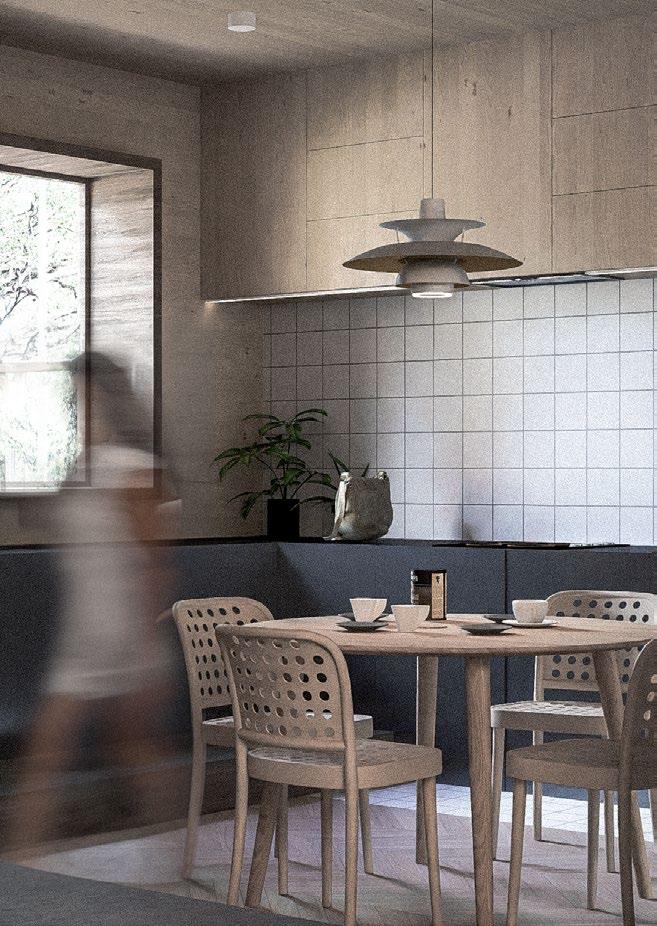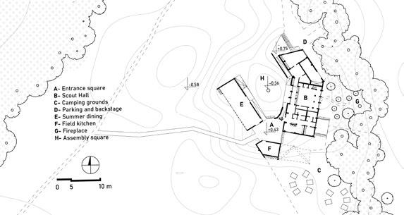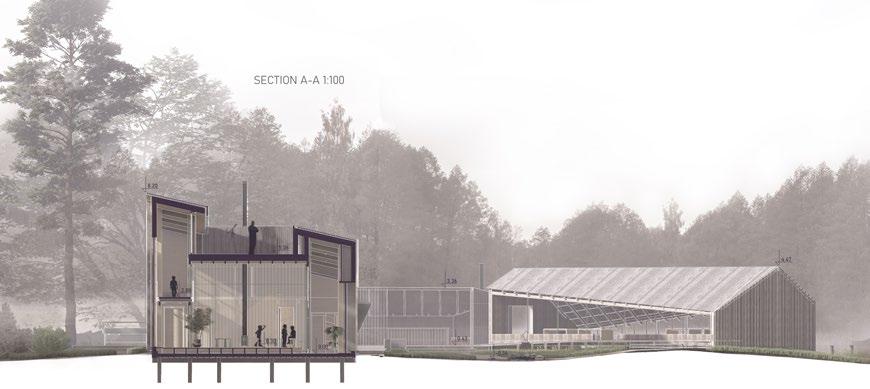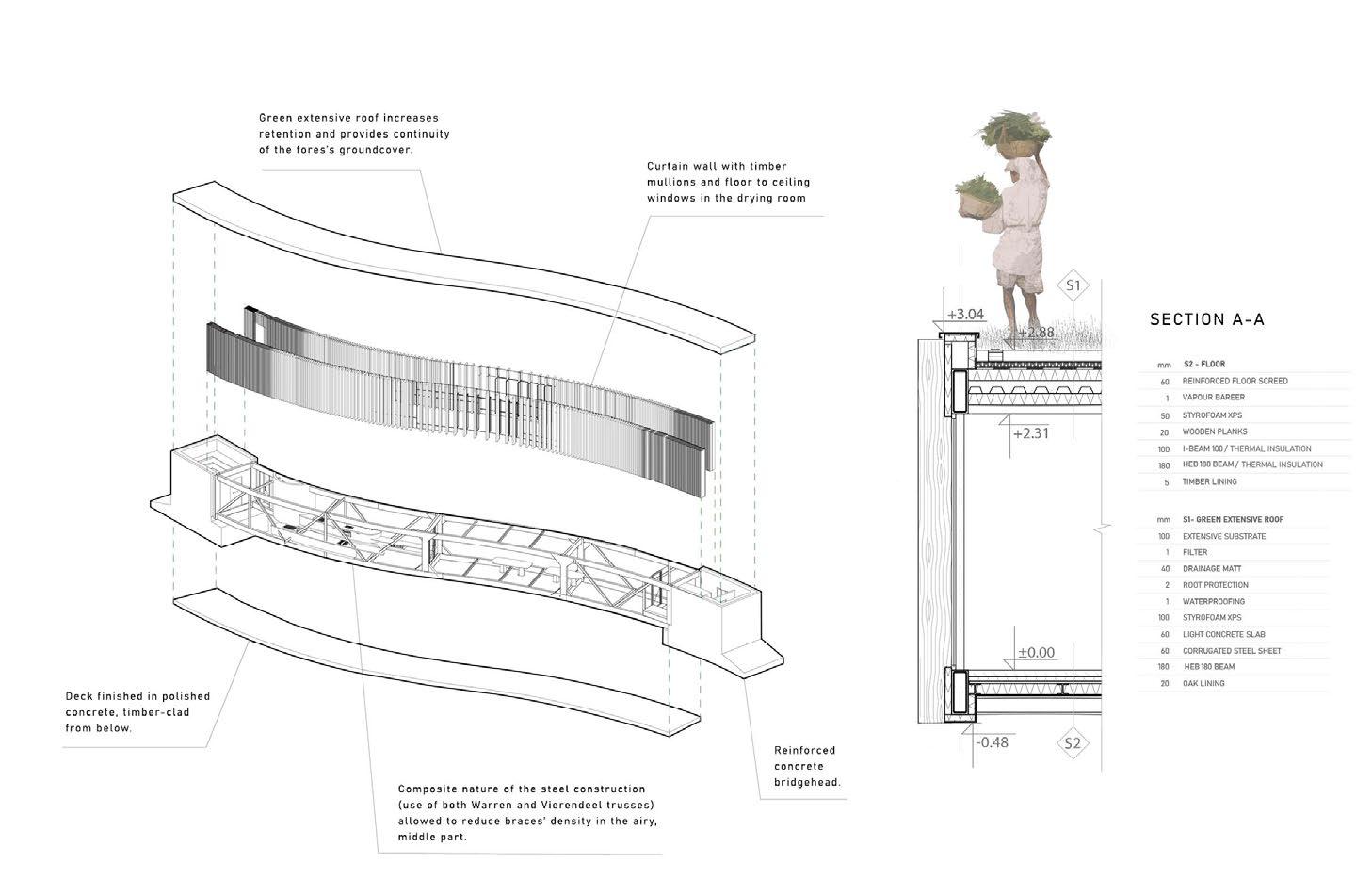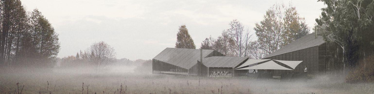 The project was inspired by our roots - the forager lifestyle of our ancestors. The main goal was creating a space for active recreation but also one that is functionally adjusted for processing and accumulation of organic goods: mushrooms, berries and herbs, naturally abundant in the Masovian forests. Our design is also an architectural divagation on the issue of sustainable management of natural resources. The bridgelike design allows for better access to crops located on both coasts of the river.