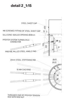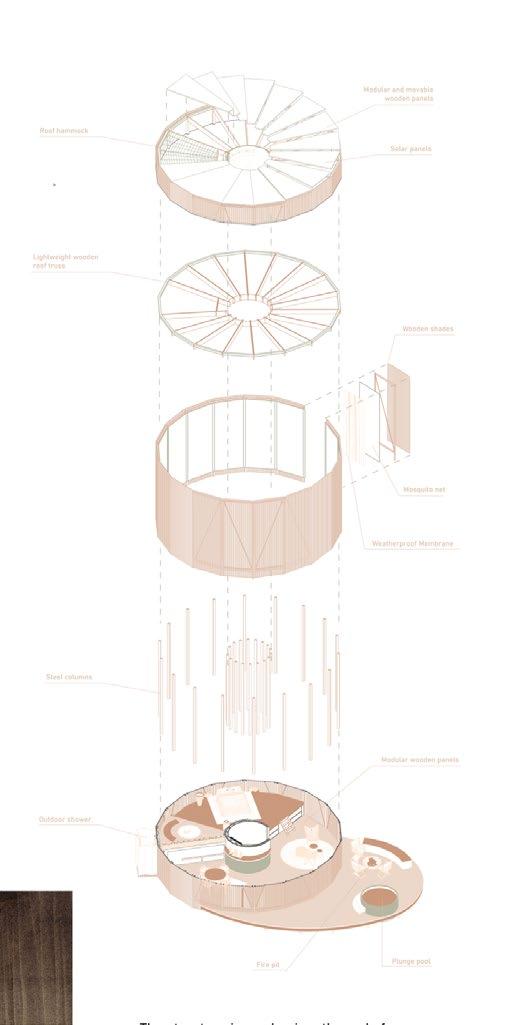 The structure is predominantly made from timber that can be easily sourced locally. It is easy to manufacture and assemble on-site in a couple of days using modular parts, larger ones prefabricated beforehand. At its entire perimeter the building is fenced with double-layered blinds that allow for air circulation. They are made of weather resistant membrane and timber cladding on an aluminum framework.
