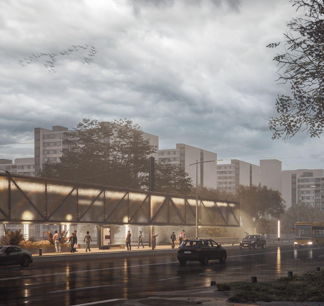 The elongated, narrow platform, shares both bus and tram stops, and is directly accessible from the metro station through an existing underpass. The main design idea was to provide a canopy sheltering both the existing stairs and the platform with as few supports as possible to save space for numerous waiting passengers.