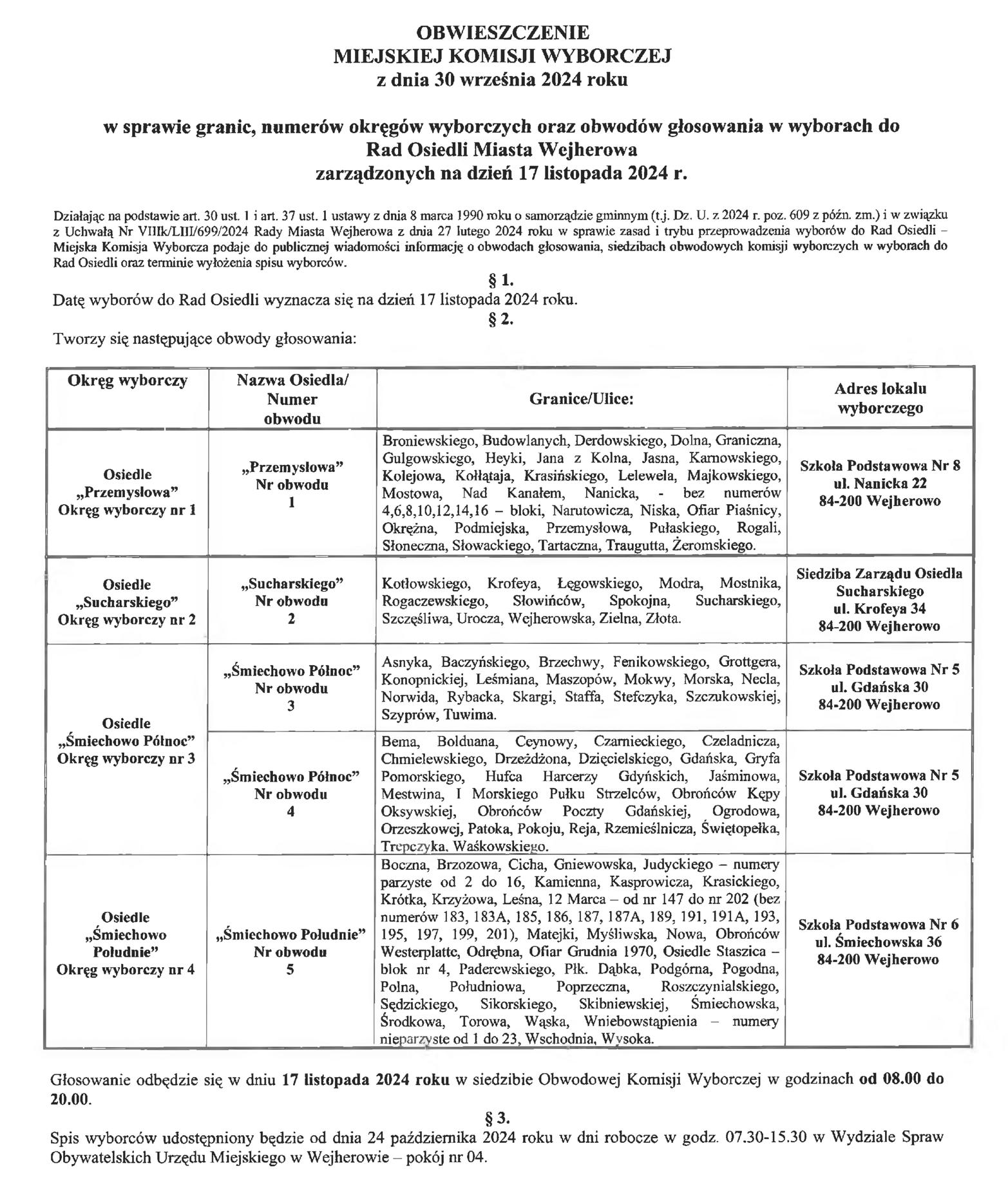 NOWA UCHWAŁA RADY! Dnia 25 września br. Rada Miasta Wejherowo przyjęła uchwałę likwidującą próg frekwencyjny 10% w wyborach do Rad Osiedli. Wejście w życie przepisu powoduje, że wybory będą ważne bez względu na to, ile uprawnionych do głosowania weźmie w nich udział. Zniesienie progu ma być krokiem w stronę utworzenia i popularyzacji jednostek pomocniczych gminy.