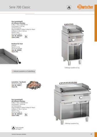 B 800 x T 700 x H 850-900 mm Anschlusswert: 18 kW Gas mit Piezo-Zündung höhenverstellbarer Grillrost (V-Rost) für Fleisch Grillfläche: B 750 x T 530 mm Gewicht: 76 kg GTIN 4015613486178