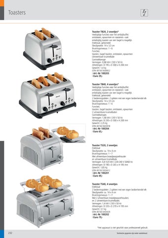 Toaster TS40, 4 sneetjes Edelstaal 2 bedieningsdelen: 2 spleten met een eigen bedienhendel elk Sleufgrootte: ca. 14 x 4 cm Bruiningsniveaus: 1 - 7 Met 2 afneembare broodjesopzethouders en 2 uitneembare kruimellades Vermogen: 1,4 kW / 230 V 50 Hz Afmetingen: B 320 x D 270 x H 195 mm Gewicht: 3,1 kg GTIN 4015613454429