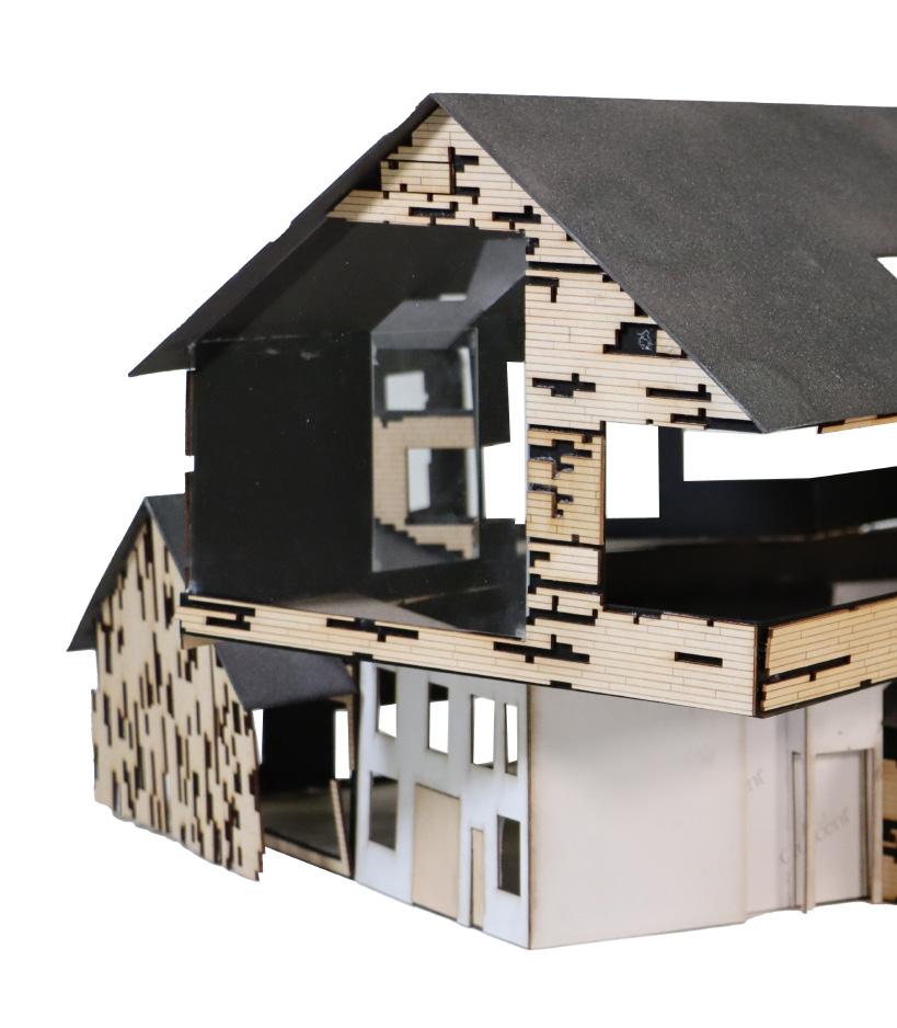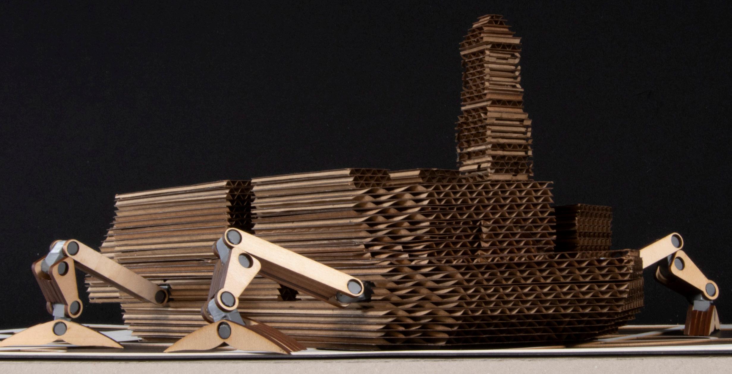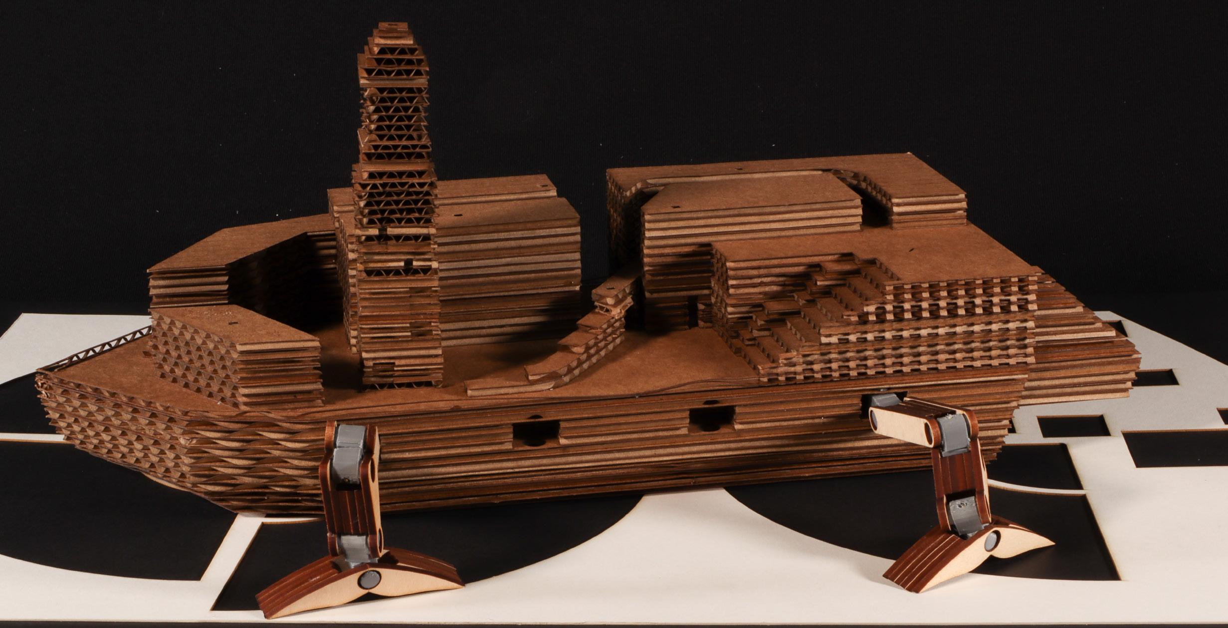 Model made from precisely sliced and stacked pieces of corrugated fiberboard. Leg joints were hand-modeled and 3D printed to