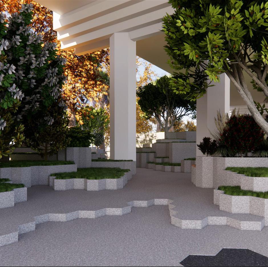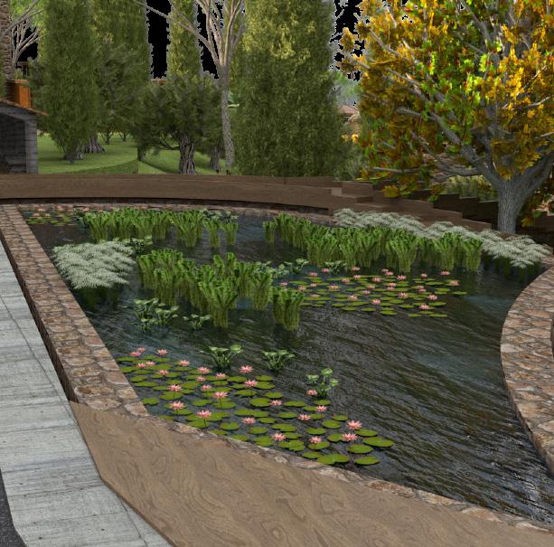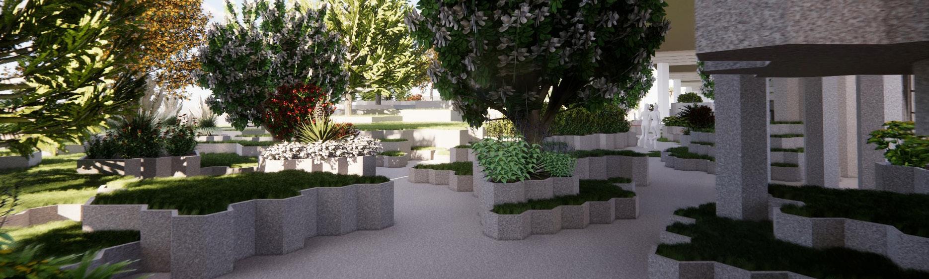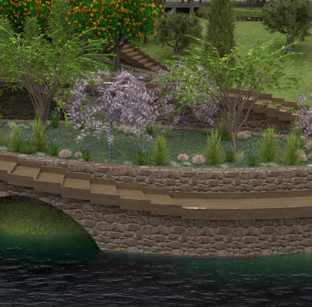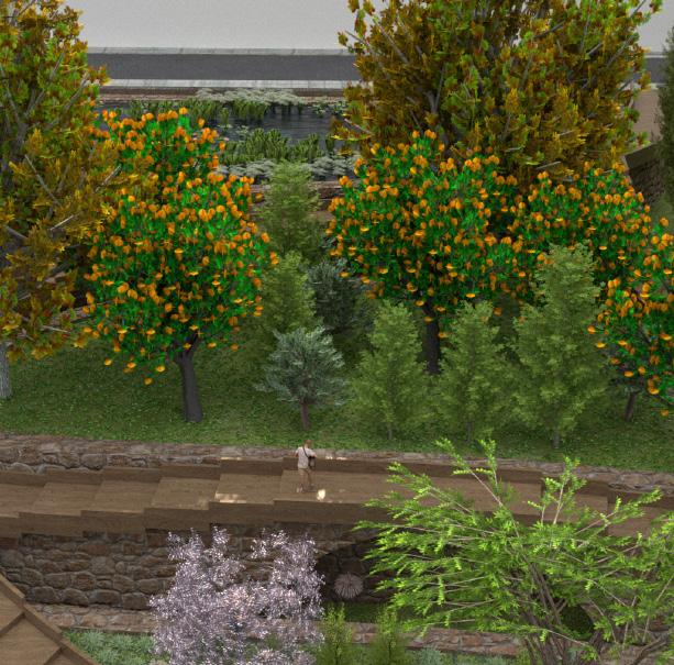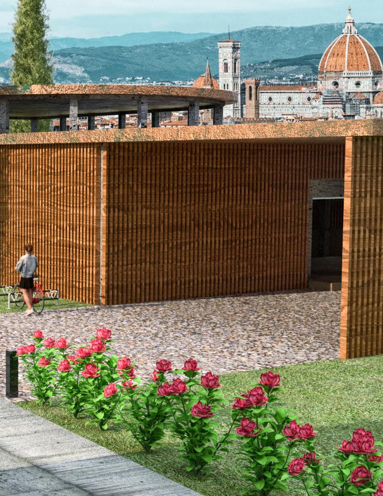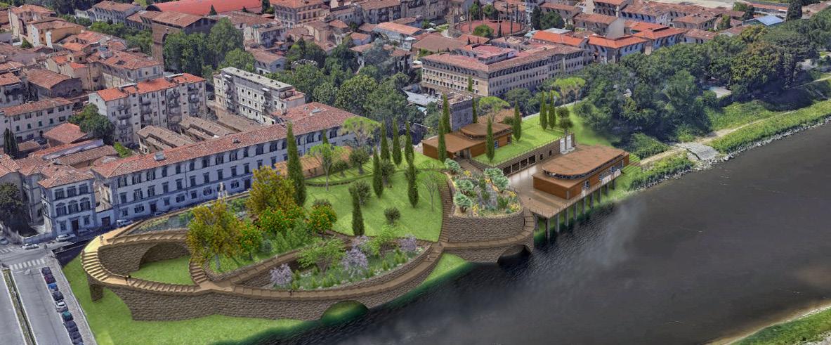 Four gardens are featured that each represent a piece of Florentine culture, nestled in a nature landscape that hearkens back to the natural history of the area. The garden closest to the road is a water garden, bounding the site by a wet environment but told in extremely different ways. This garden is the most manicured and regulated, contrasting the complete natural takeover of the river. The next garden is the Medici garden, featuring iconic Italian plants as well as the signature orange trees of the family that built the renaissance