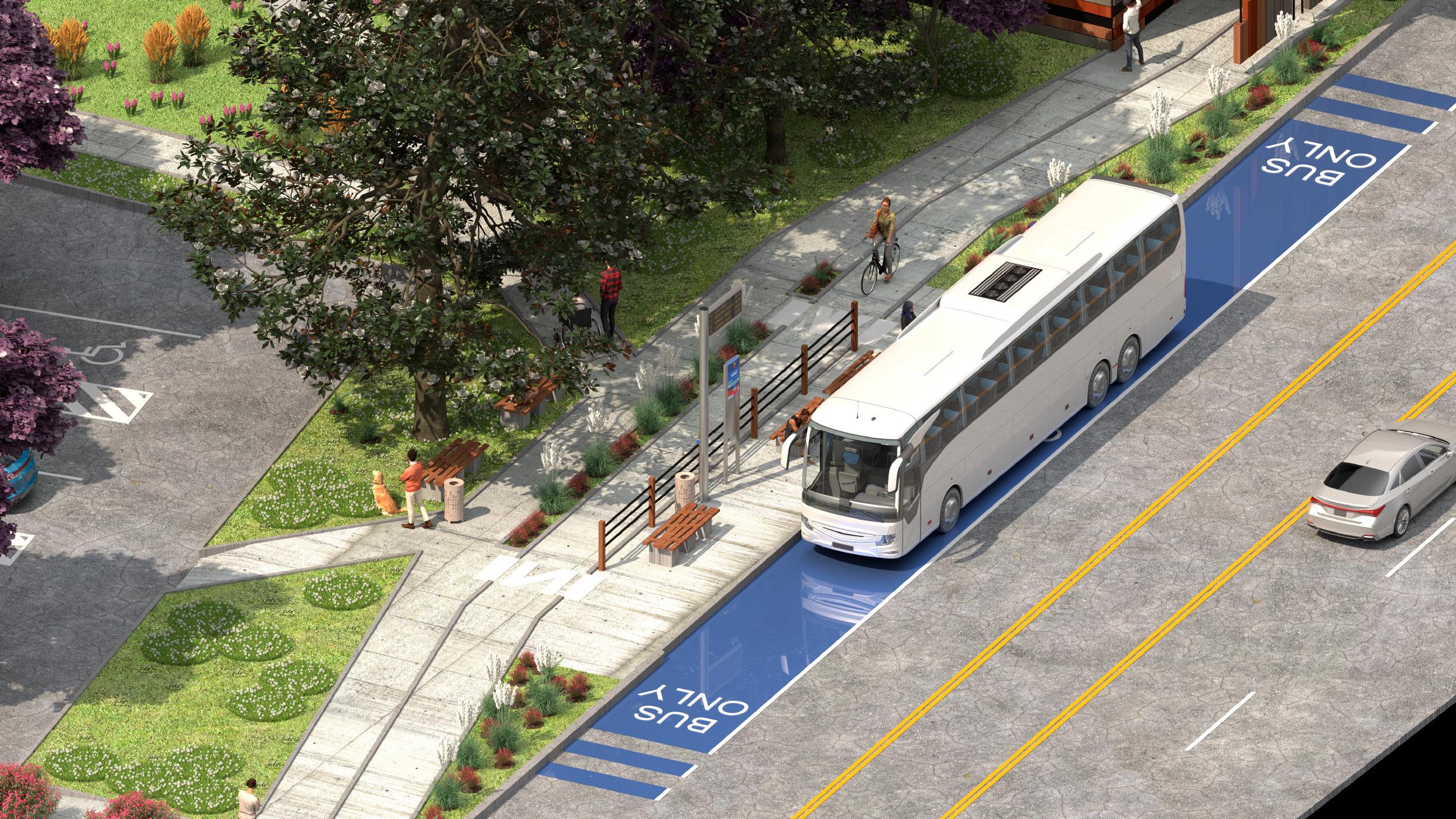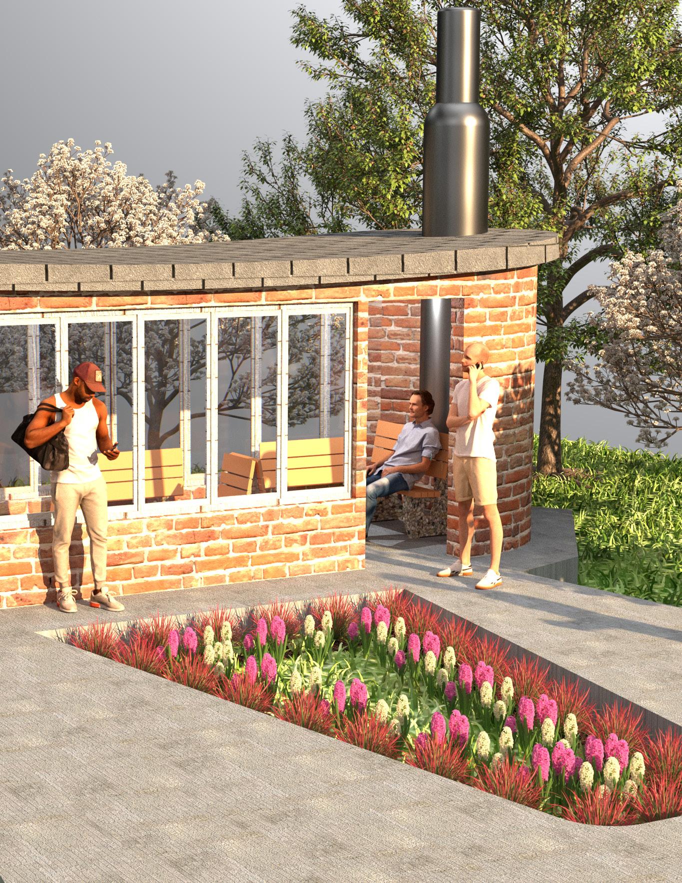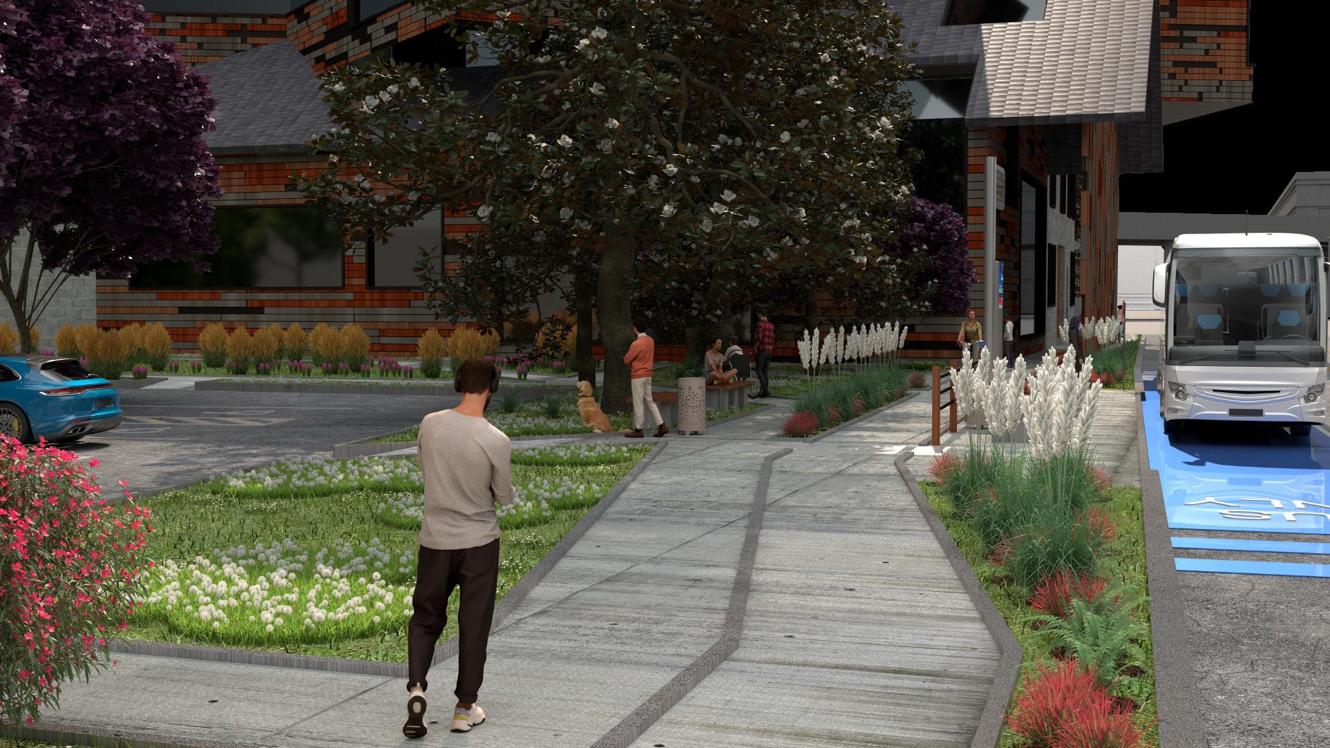 View of the bus stop, the main form of transportation to the site. Because this was to be something mainly utilized by locals and residents of the community, rather than as a tourist attraction, parking was limited and a bus stop and bike path were added as more eco-friendly ways to travel. All parking spots on the site are either for compact cars or ADA complient spaces.