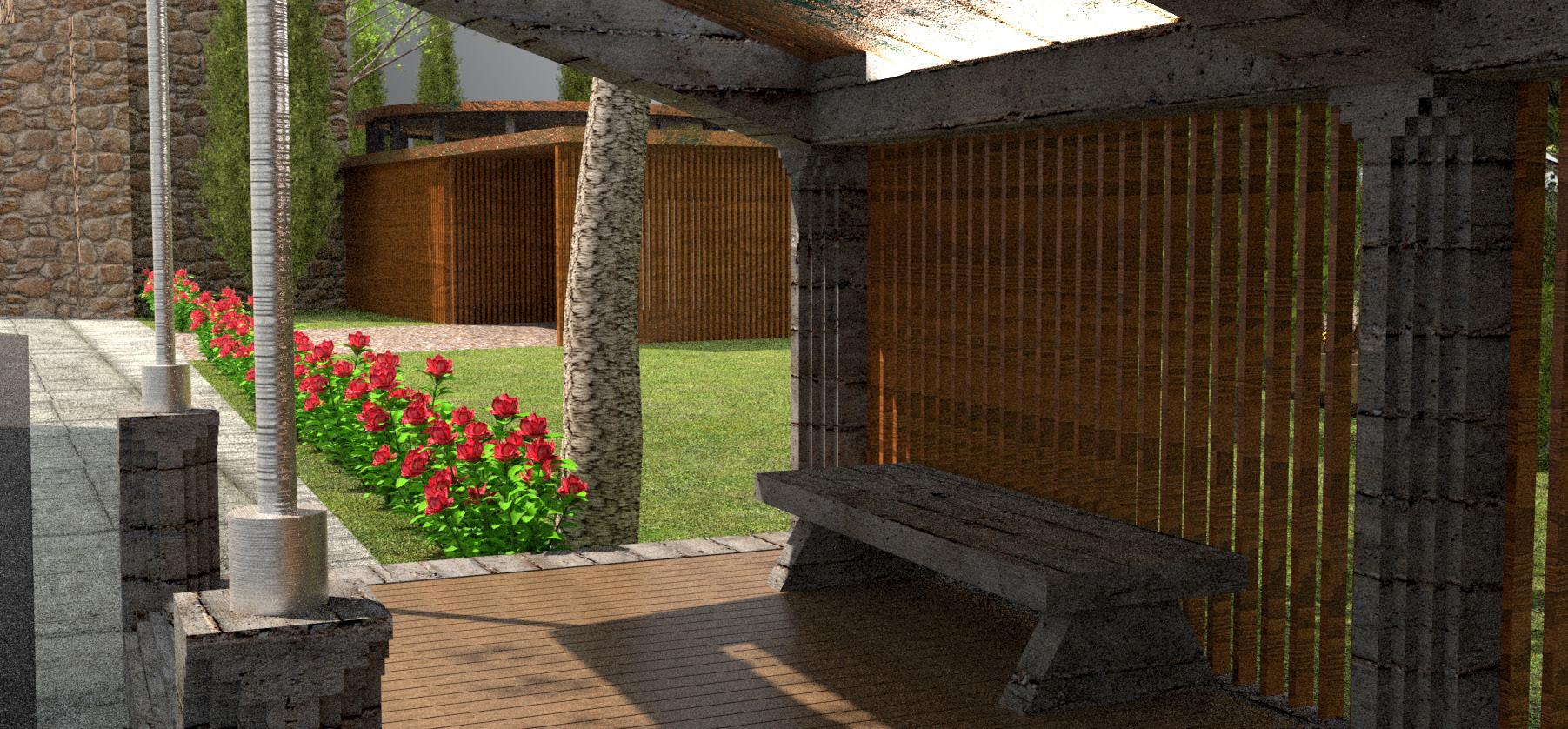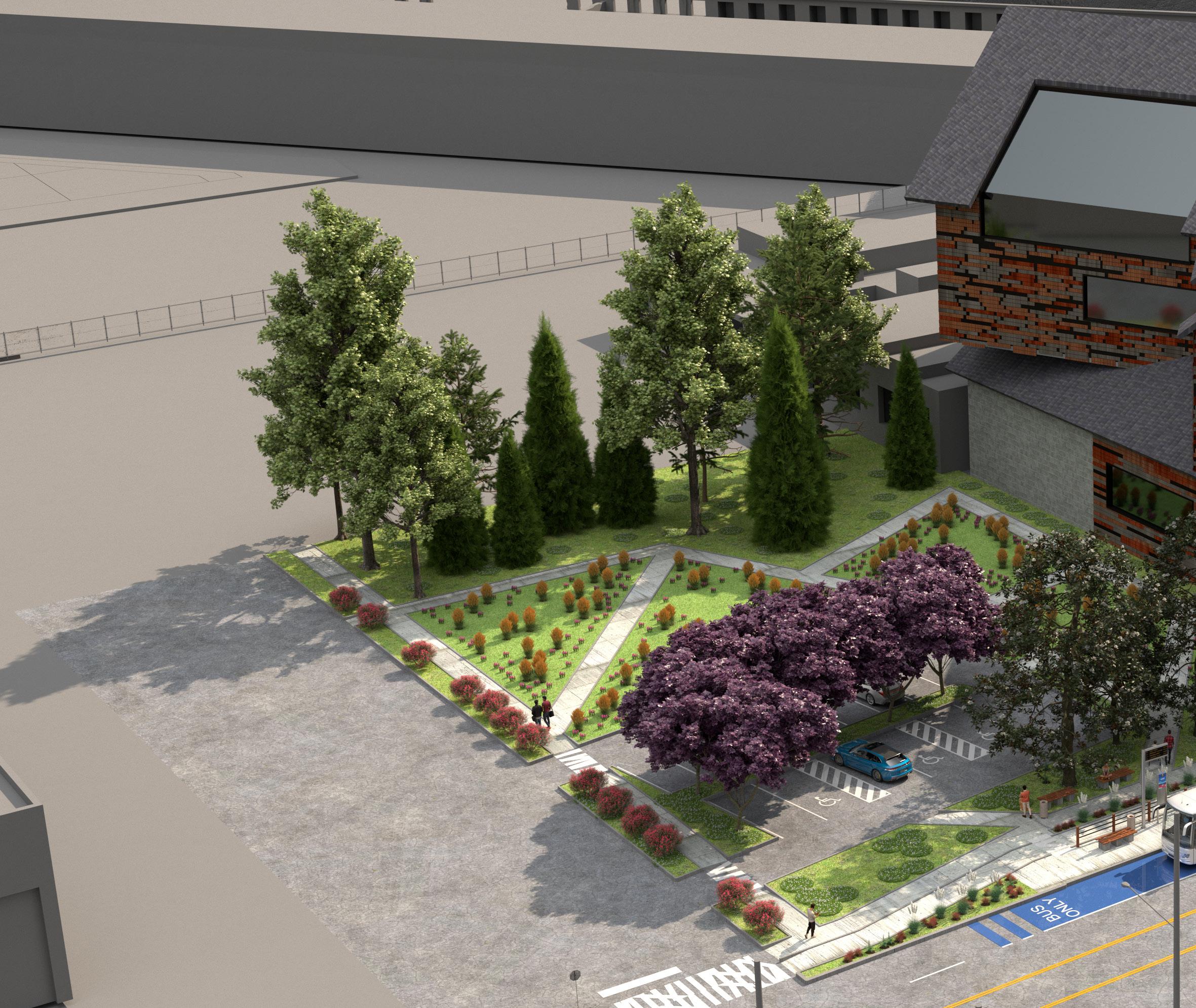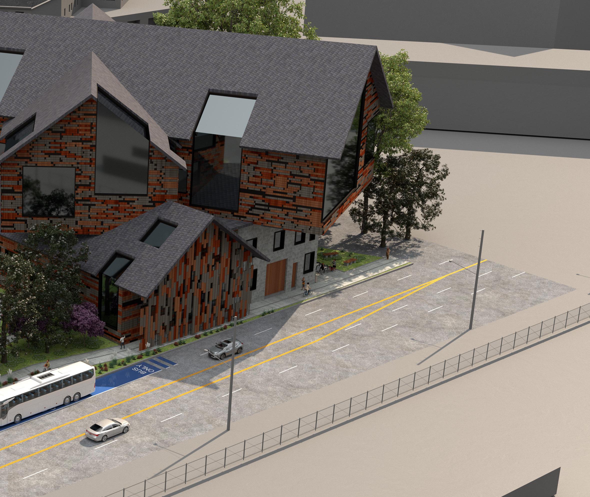 View of the bus stop, the main form of transportation to the site. Because this was to be something mainly utilized by locals and residents of the community, rather than as a tourist attraction, parking was limited and a bus stop and bike path were added as more eco-friendly ways to travel. All parking spots on the site are either for compact cars or ADA complient spaces.