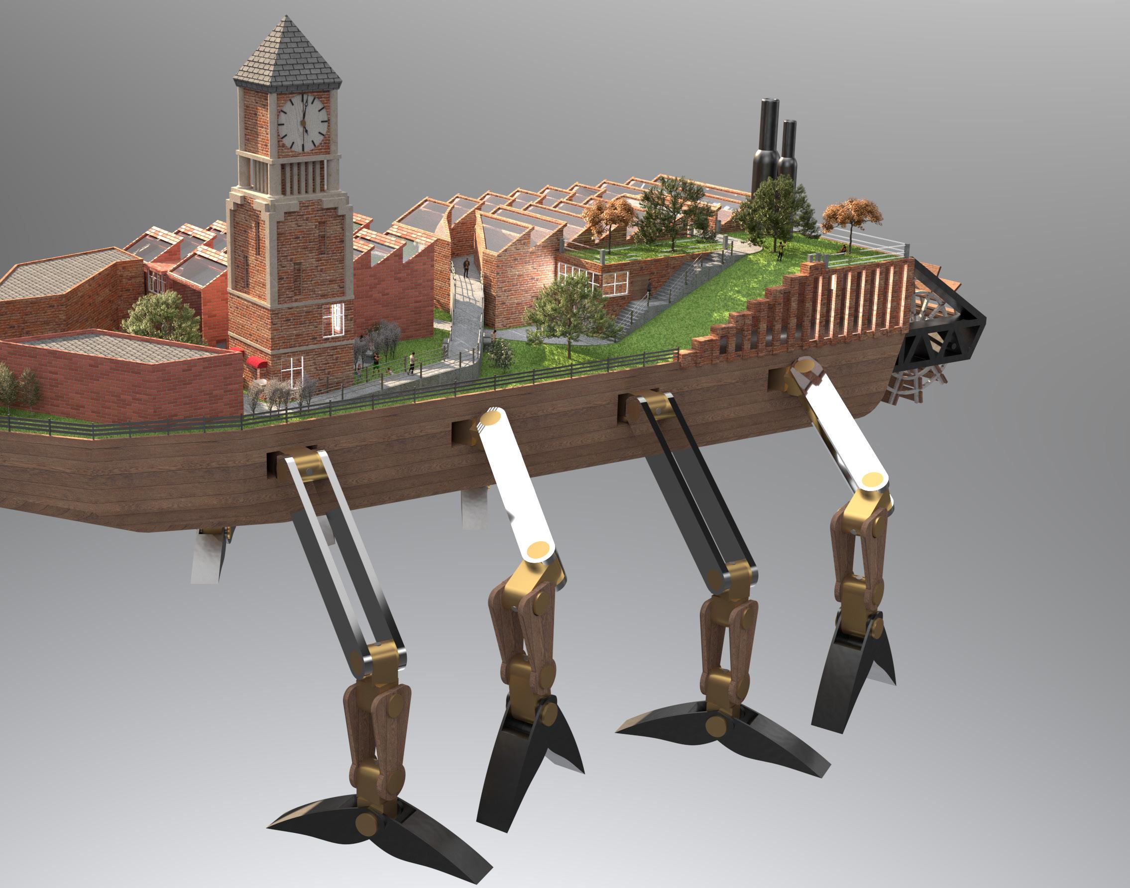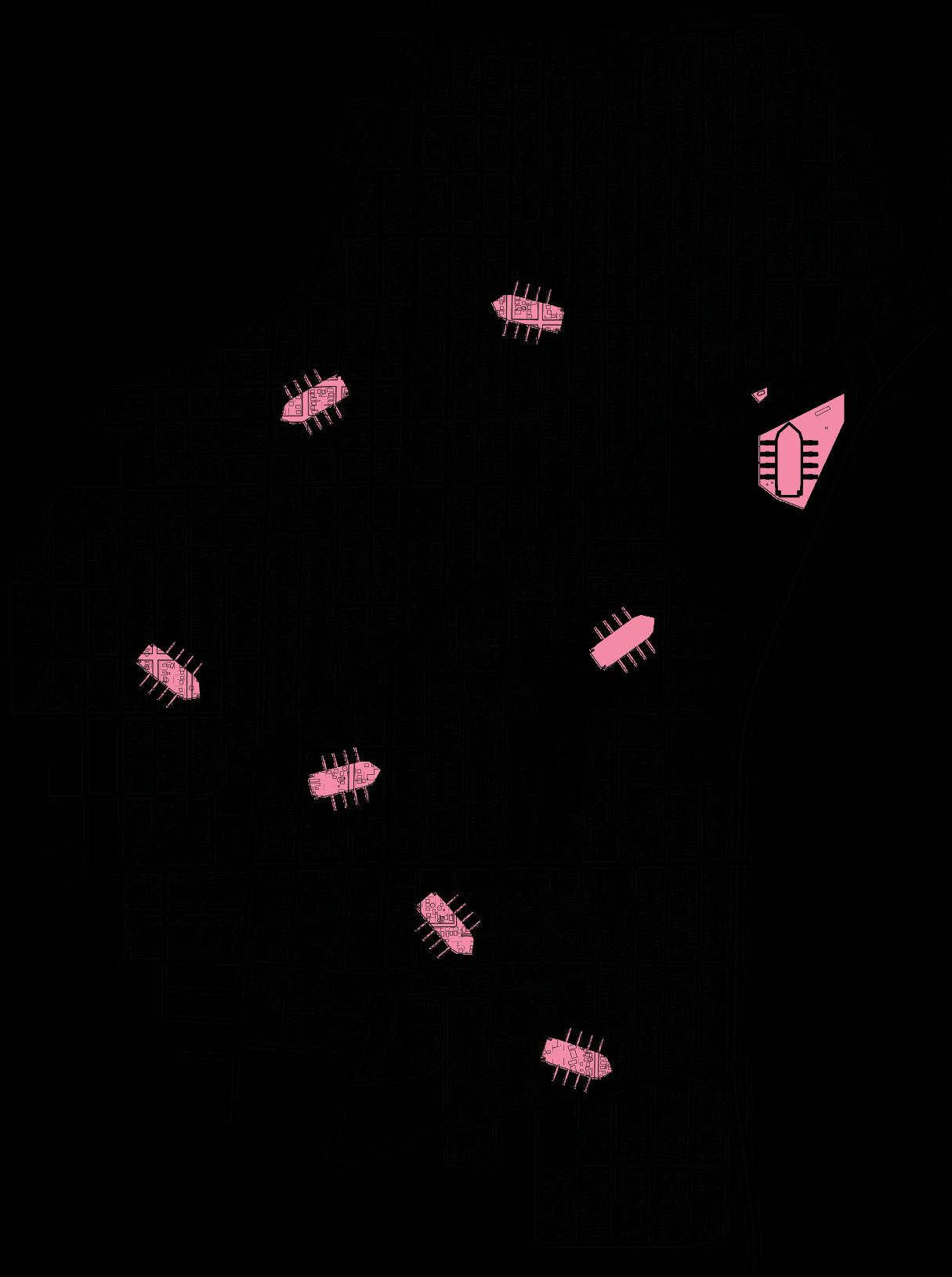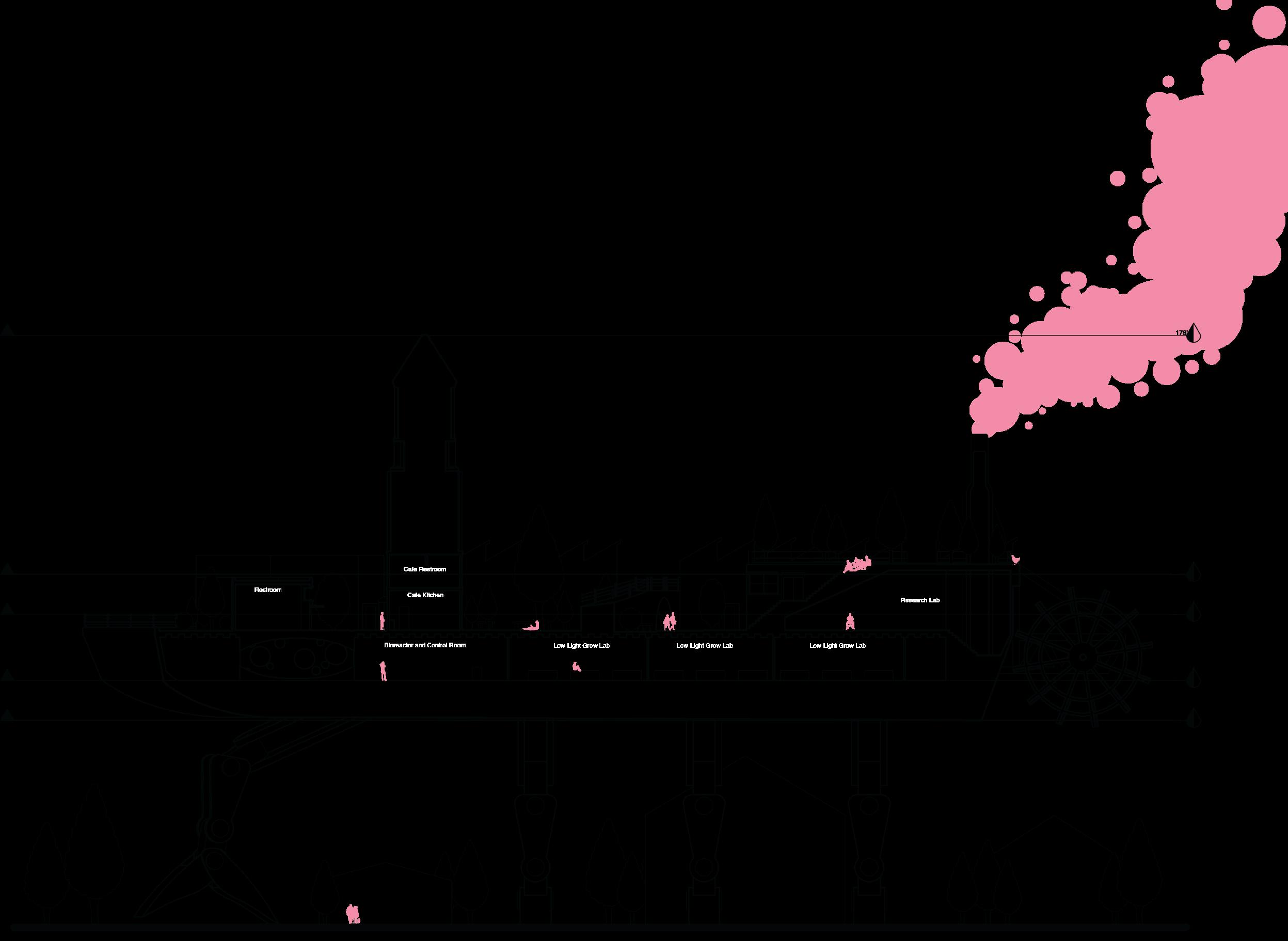 This superstructure houses the campus of an agricultural research and education facility. The entire “block” of the twisted urbansphere is then affixed a steamboat, similar to the ones that would traverse the Ohio and Cuyahoga Rivers, continuing to build on to the historical form-finding. The agricultural facility walks throughout the city and helps to address community issues of food deserts by supplying produce as well as knowledge of agricultural methods and resources.