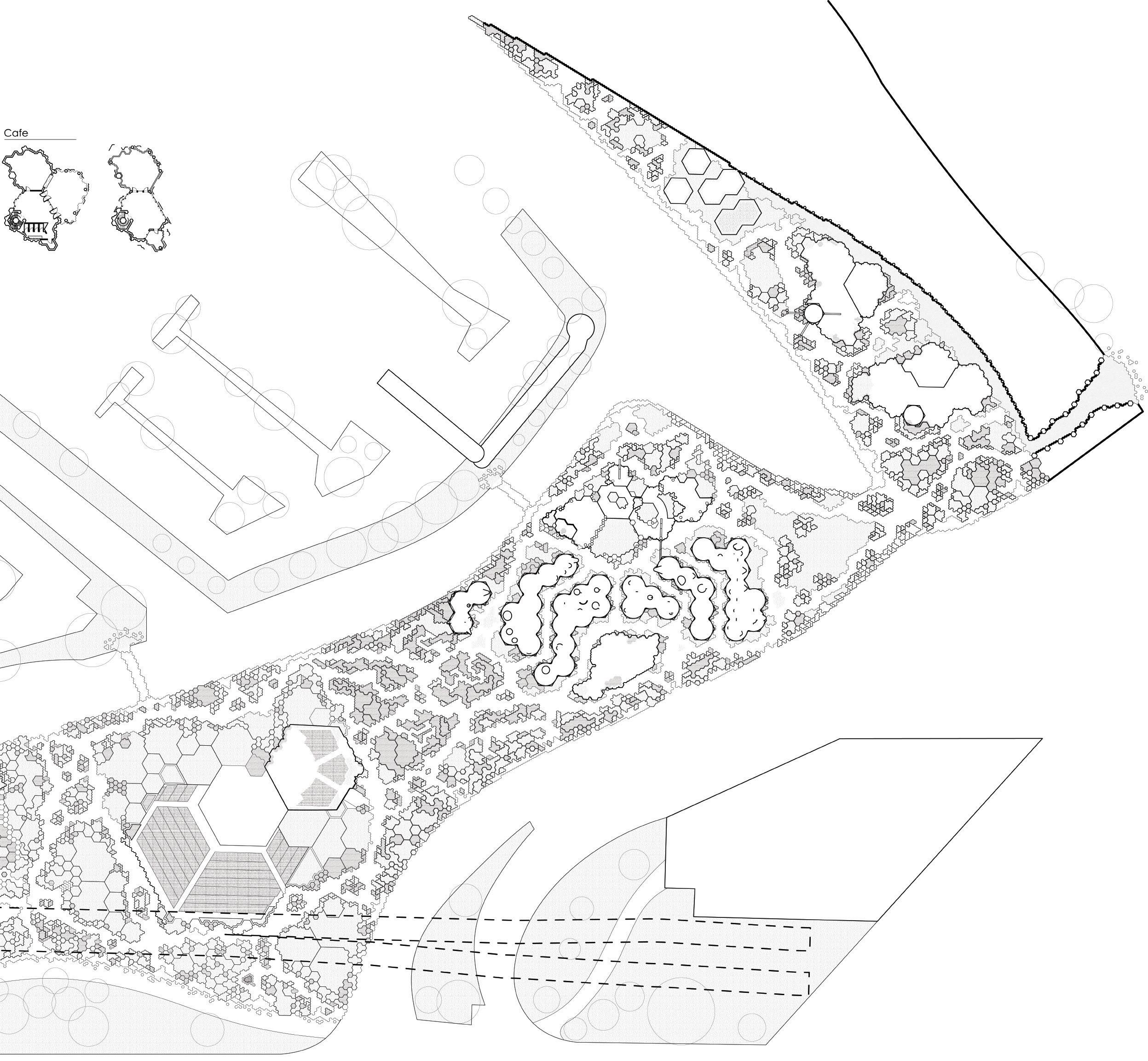 The hexagon is very key to this design as its soft angles are what allow the paths to form and weave throughout the site. The angles of the hexagon provide a sort of subconscious bifurcation which is employed in diverting various