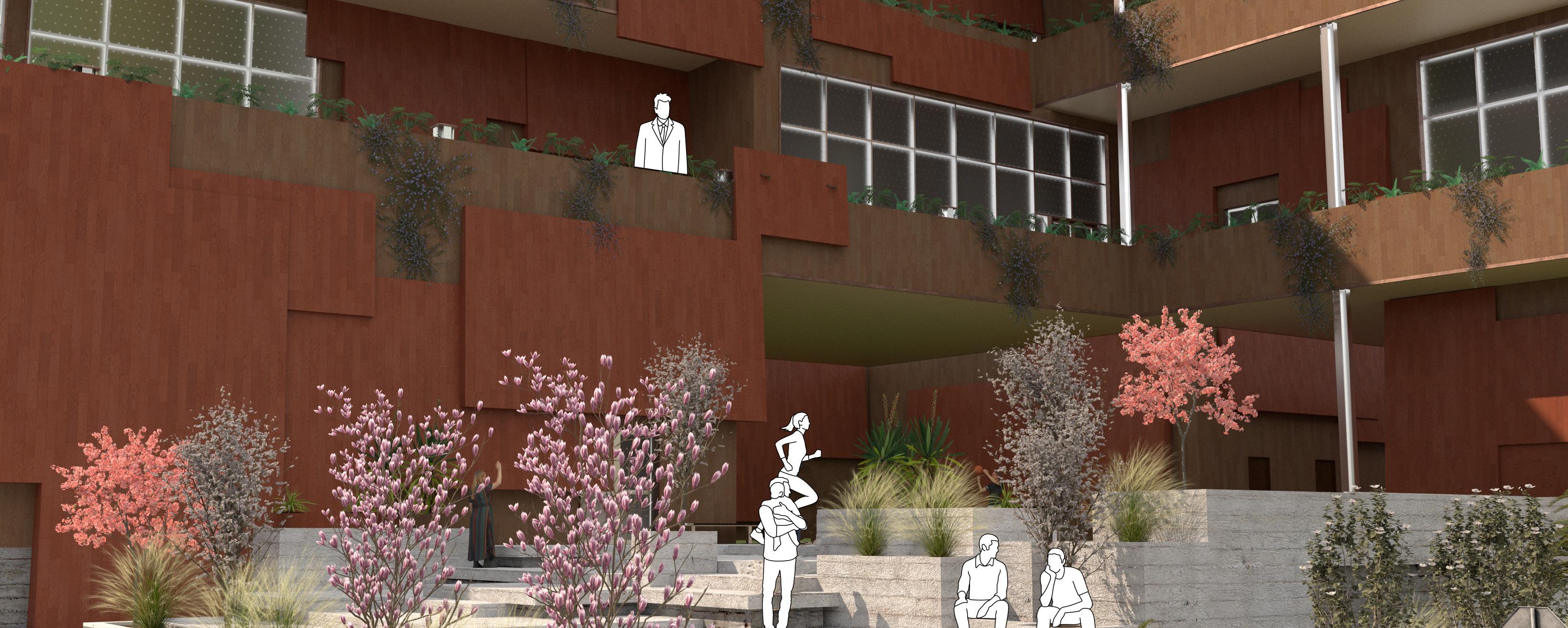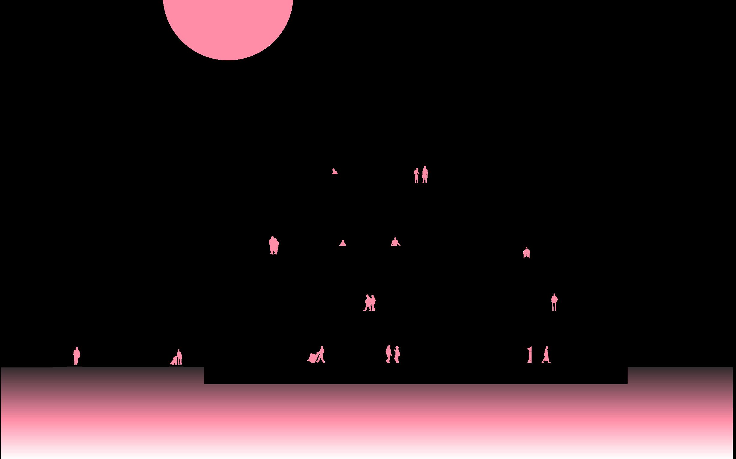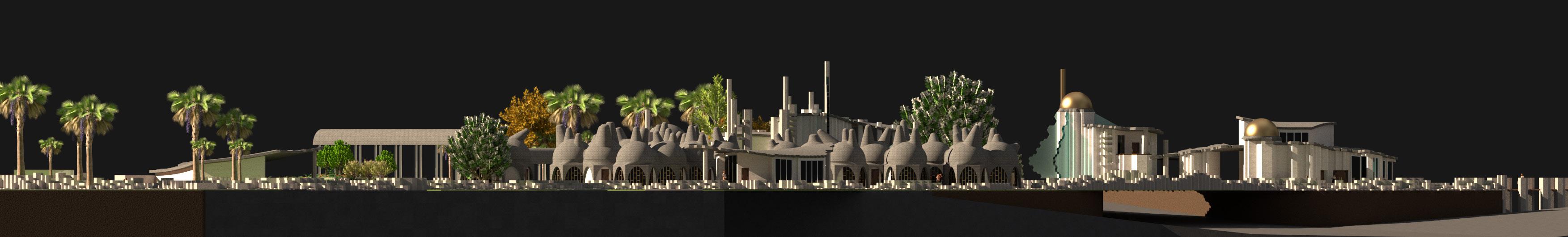 The project was required to have a form of housing, of which I chose a dormesque space that would be able to house queer youth who are kicked out of their homes. As the site location was in Florida, an area bordering on totalitarian genocide when it comes to queer people, I wanted to be able to create a safe space for those targeted by violent design, law, and culture. An important aspect of maintaining the safety of the inhabitants in a design sense came with the roof. The Clark Thenhaus-inspired forms soften the edges of the structures and envelop them with a tensile curtainlike form. Seen from above the housing is hardly noticeable, and from a distance it’s hidden behind the urban-scape, requiring one to actively seek out the site to be able to see and access it.