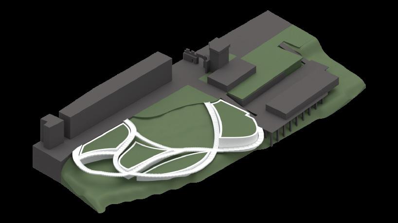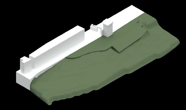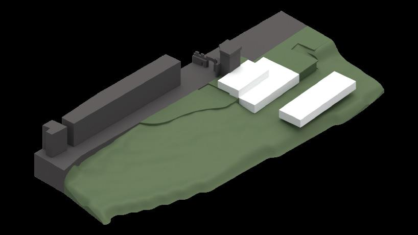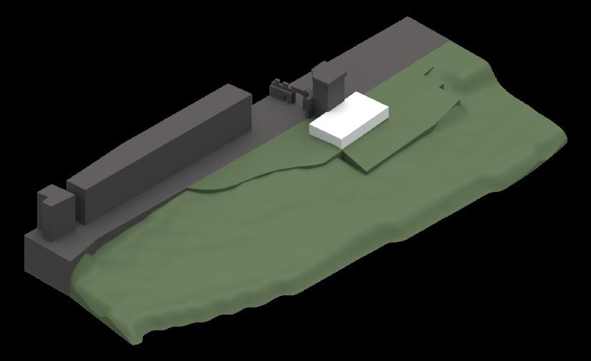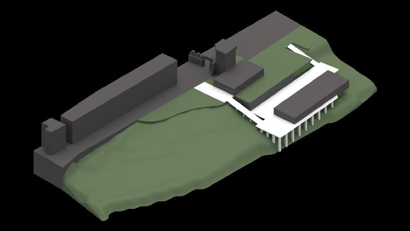 the design process I followed started with examining the site and the historical context it housed, then boxes were placed on the site each with varying interfaces, one sitting on top of the ground, one sitting in the ground, and one suspended above the ground. A deck was put in to further contextualize the massing within the site and finally the gardens were added with a winding path connecting them, the structure, the city, and the river.