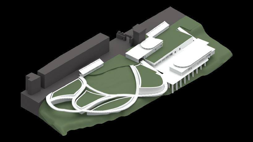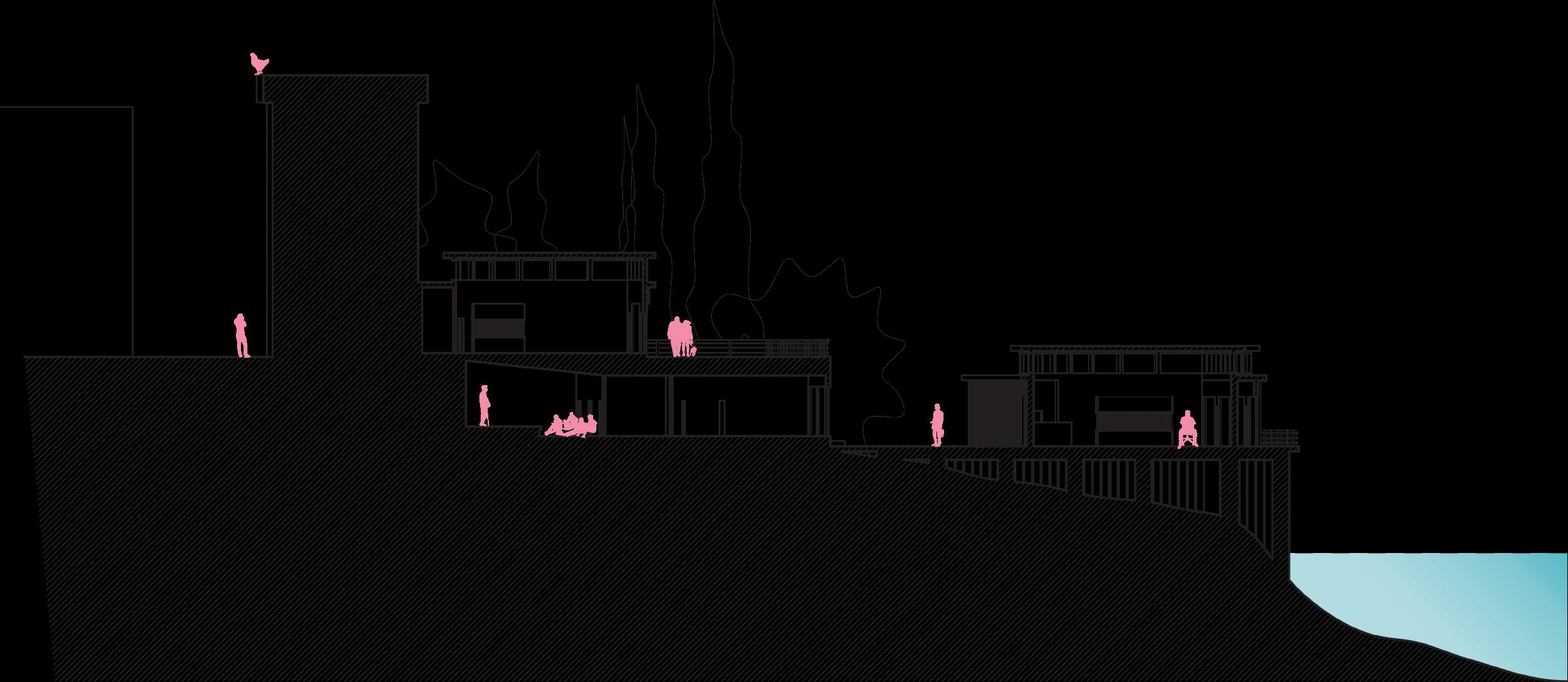 I really focused on the landscape aspect of the project, working to rigorously research different tenants of garden design, seasonal change, site ecology, and isolationism. For this research I drew heavily on the body of work of Gilles Clement and ideas of ambiguous space in the urban sphere. A majority of the structures are floated above the site in order to provide as little ecological impact as possible, with the bank being reclaimed by nature.