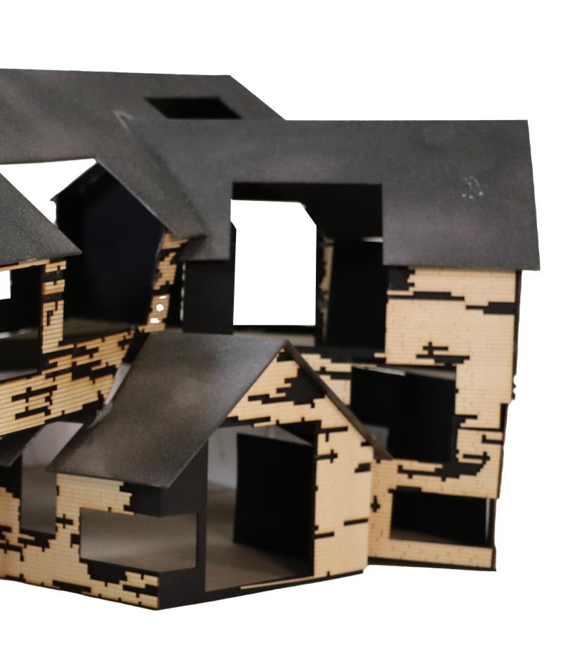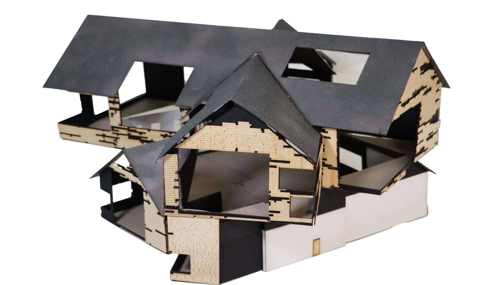 From plan view, these large masses break though each other forming various series of interlocking space at the overlaps. This space is dealt with in a variety of ways throughout the project, sometimes being walled off from the other mass, sometimes being shared between the masses, and sometimes being completely isolated, forming a new mass altogether in an interplay between inclusion and exclusion. The changing ceiling also reflects the interlocking masses, forming gable-like structures that intersect and cut though each other, subtly denoting space in places where walls do not.
