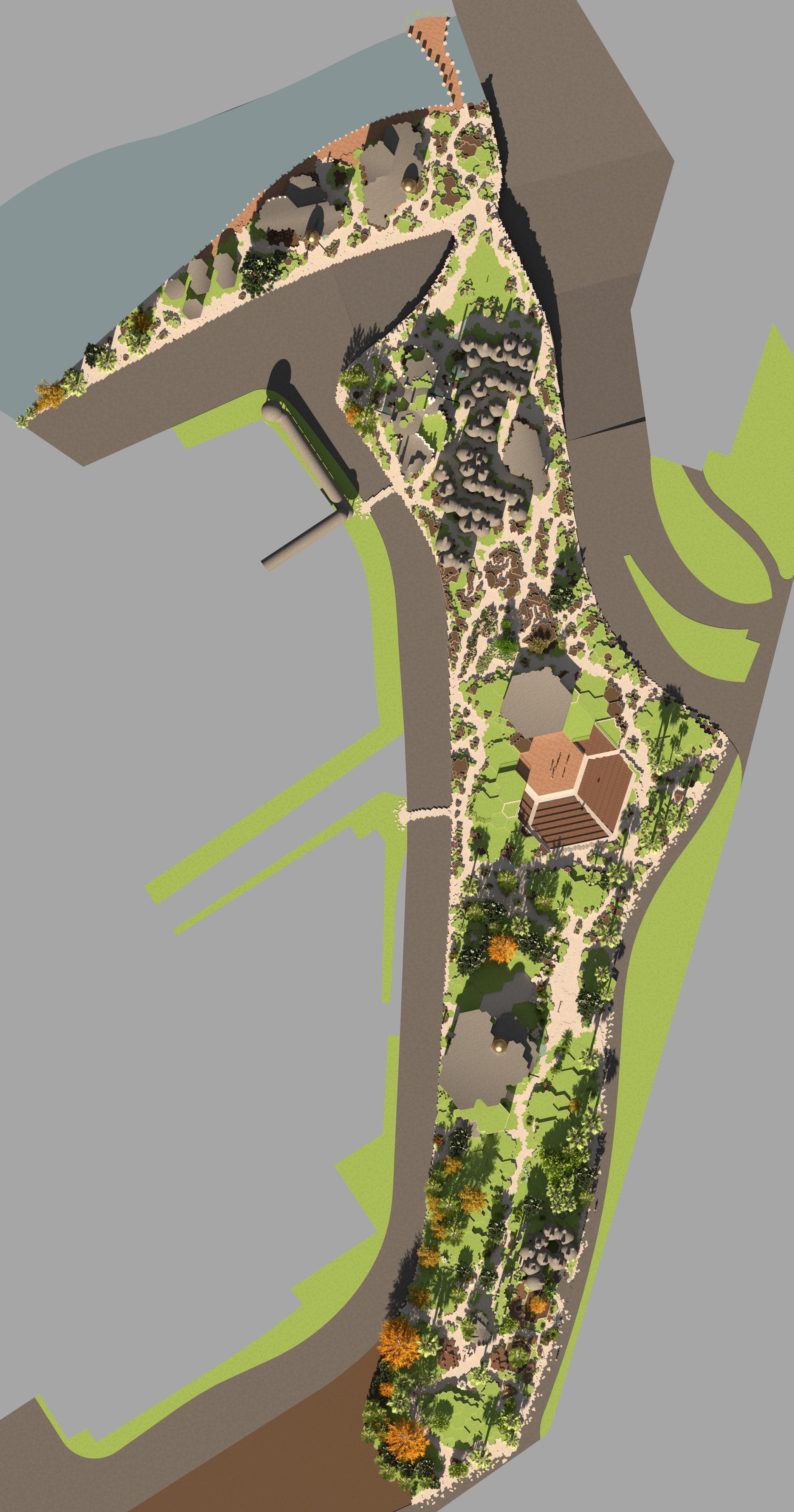 pathways out without making it seem like new paths. The goal was to create an area which developed its own ambiance outside the city and an important part of achieving this was a subconscious isolation, achieved through the slowly winding labyrinthian path system.