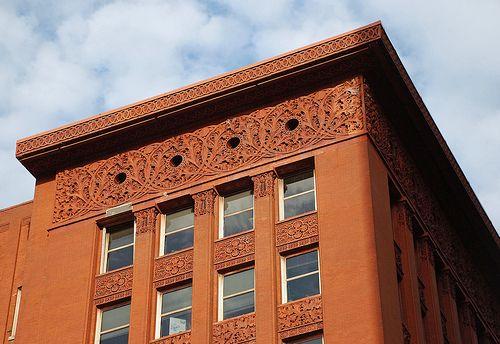 The Wainwright building, one of Sullivan’s most known works, is key to analyzing his ornamental style, as well as starting to see how erotic it becomes. Sullivan describes this building very similarly to how he describes men in his autobiography, mentioning how dominant it is, strong and powerful – able to command the landscape and stand erect on the street. Much of the ornament on the exterior is subtle, a sort of blink and you will miss it moment, yet, once it is perceived it cannot be hidden again.