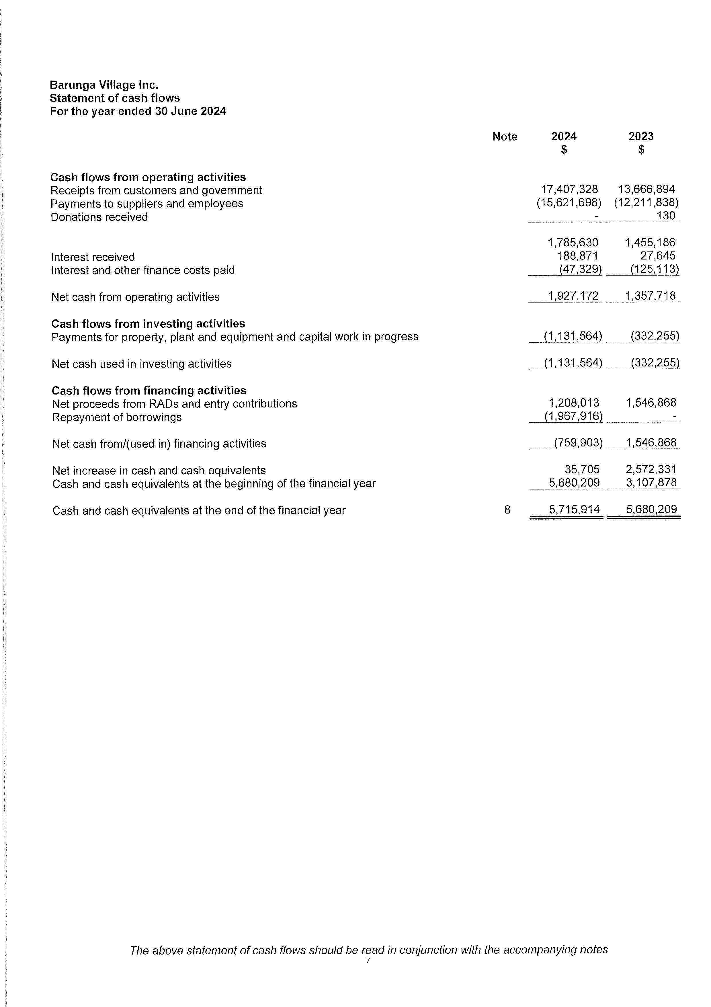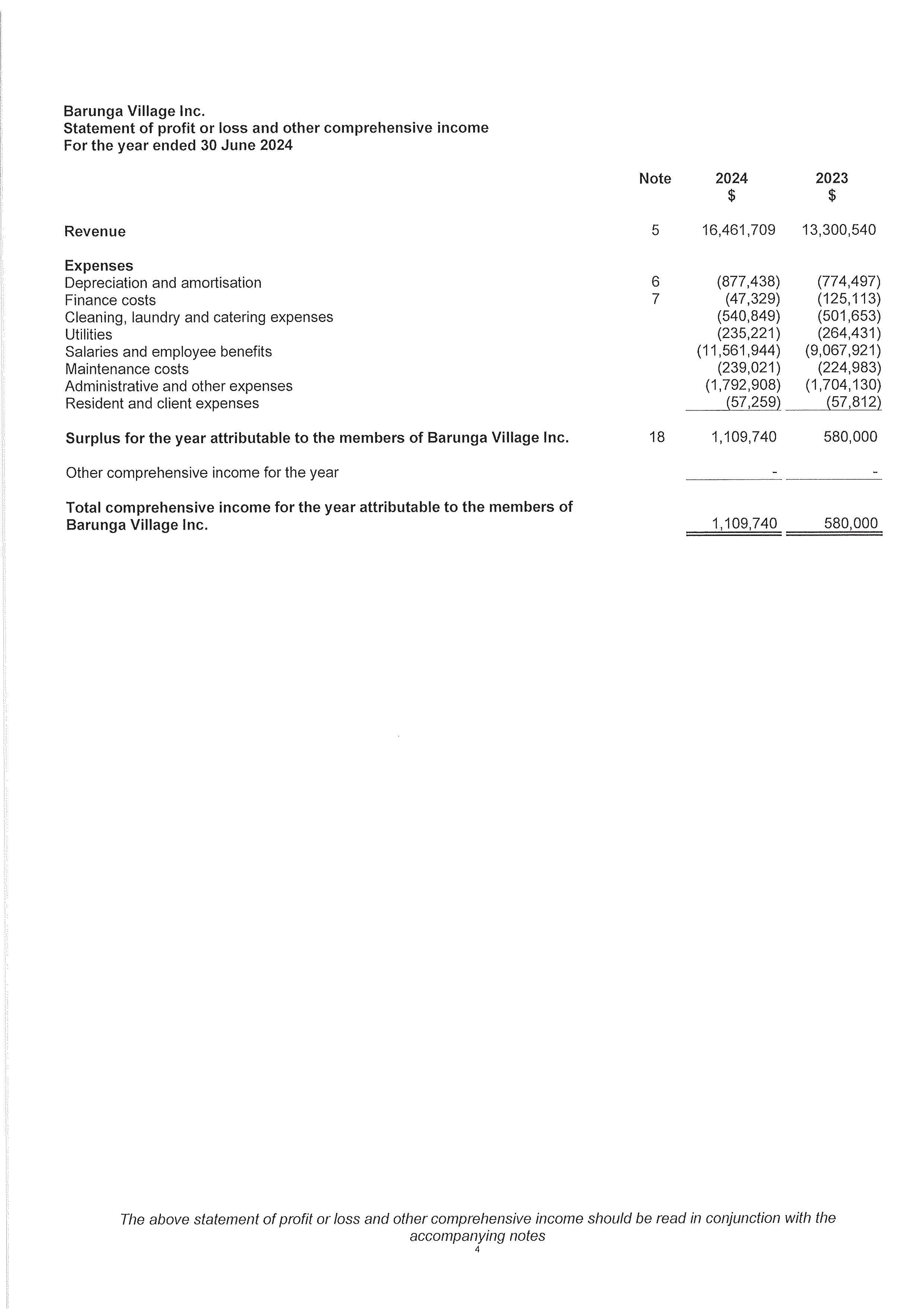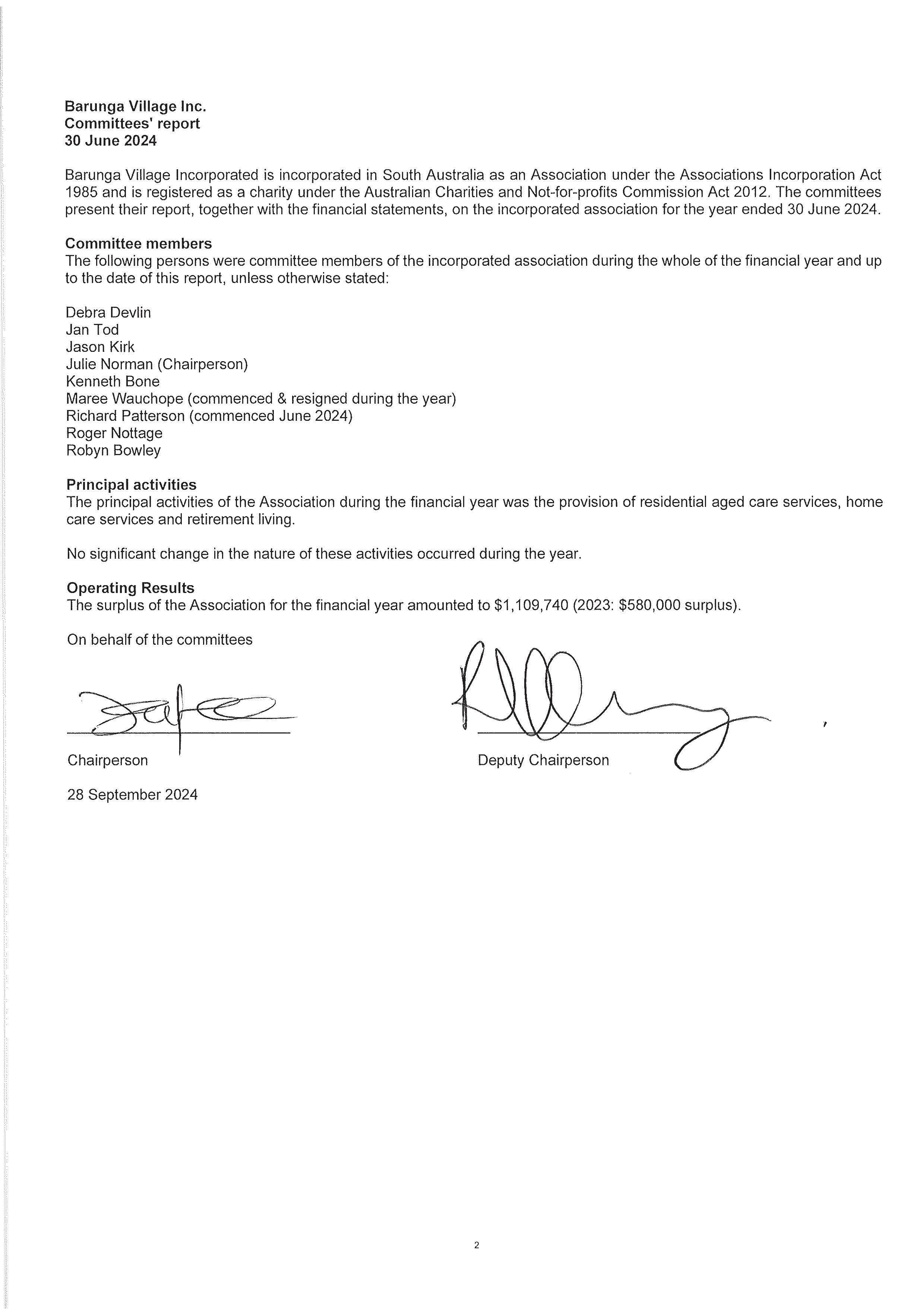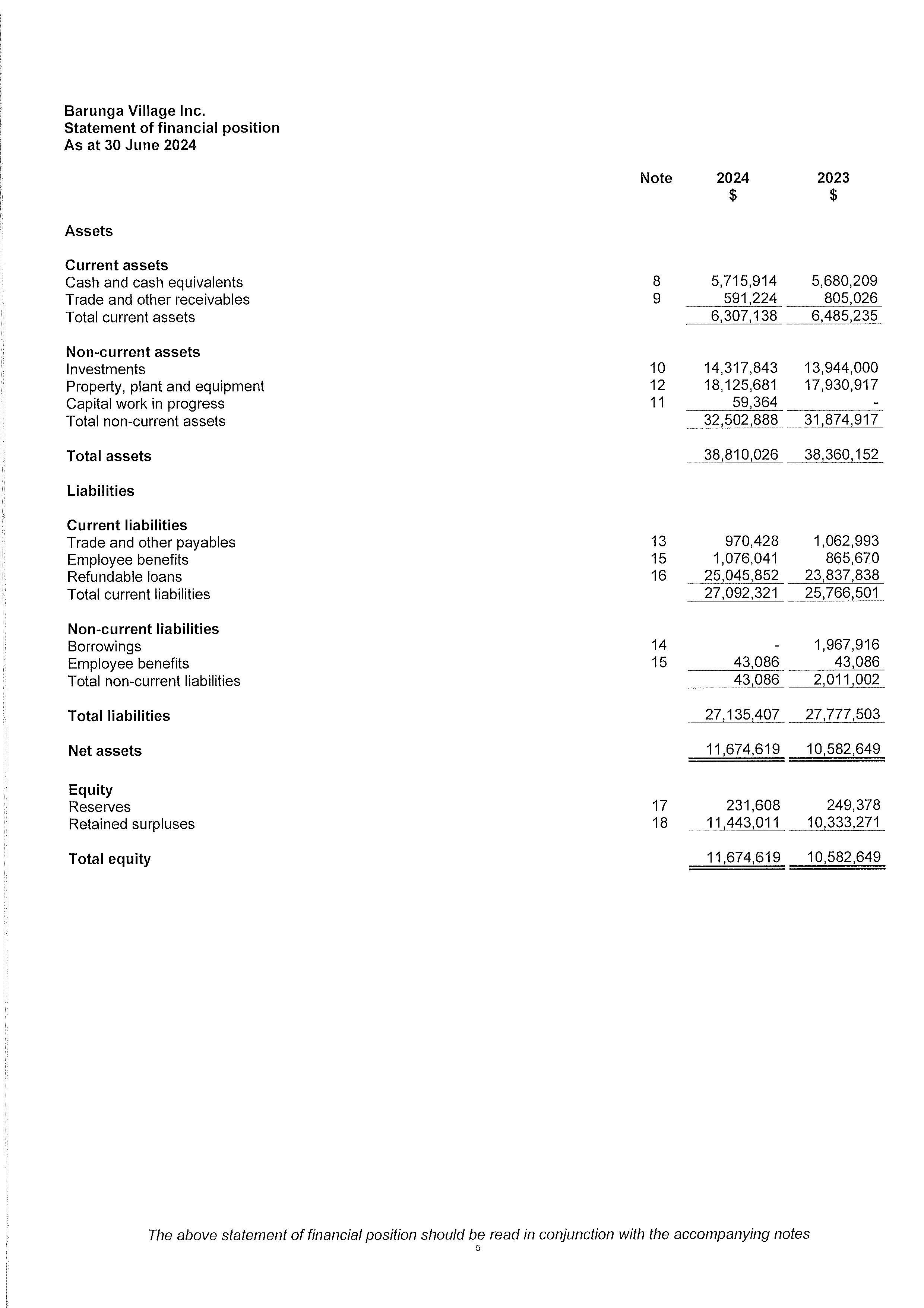 In our opinion, the accompanying financial report of Barguna Village Incorporated (the Association) has been prepared in accordance with Division 60 of the Australian Charities and Not-for-profits Commission Act 2012, including: giving a true and fair view of the Association’s financial position as at 30 June 2024 and of its financial performance for the year then ended; and complying with Australian Accounting Standards and Division 60 of the Australian Charities and Notfor-profits Commission Regulations 2022