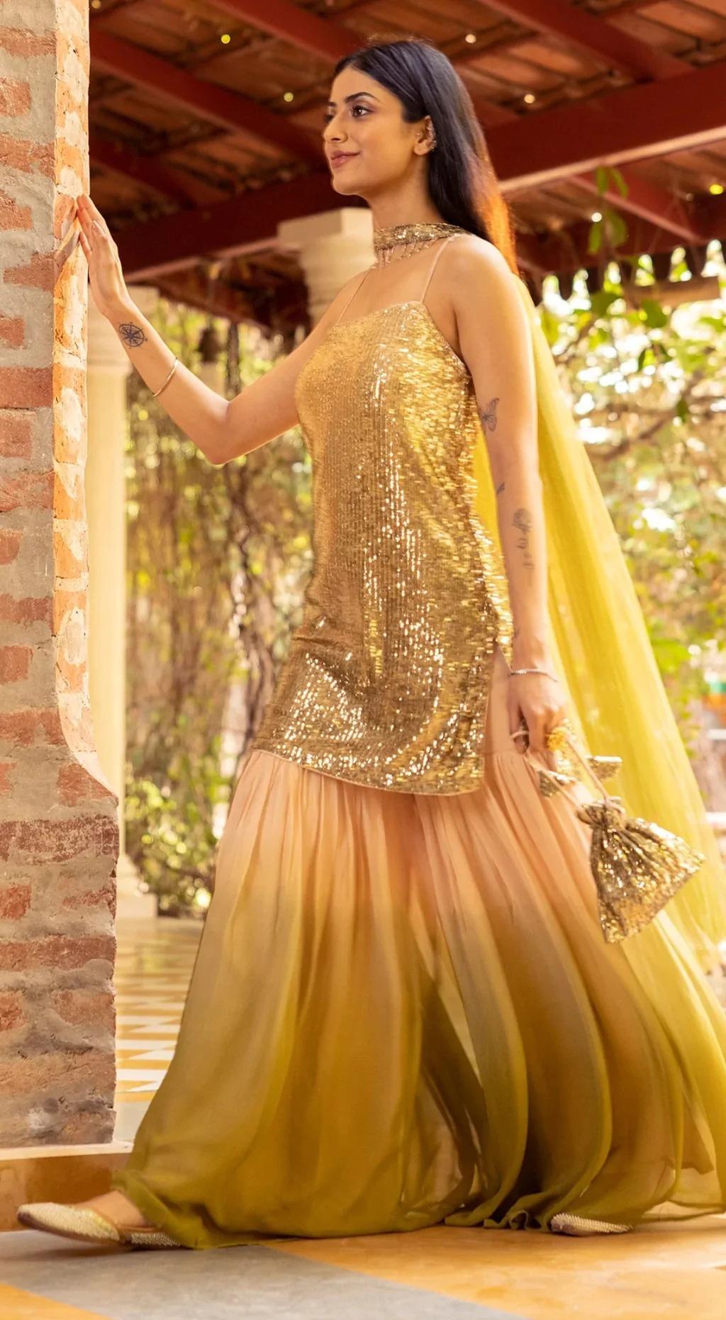 Sequins Ombre Sharara Set SANGEET OUTFITS for more information www basantikekapde com PinkMirrorWork LehengaSetWith ContrastingGreen Dupatta PinkSequin Embroidered Anarkali WIthBelt