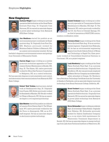Daniel Graham began working as a cyber security specialist at Transmission System Maintenance in Mandan, ND, Sept. 15. The Bismarck, ND, native previously worked for the U.S. Air Force in Colorado Springs, CO, as chief of operations of MATCOM communication coordination center. Terrence Kizer began working at the Great Plains Synfuels Plant Aug. 18 as an environmental engineer. Originally from Wakonda, SD, he has an environmental engineering degree from South Dakota School of Mines and Technology in Rapid City. Kizer previously worked at Consolidated Analytical Systems in Cincinnati, OH, as a project engineer. Leah Newberry began working at the Great Plains Synfuels Plant Sept. 8 as a process operations field technician. Originally from Pendleton, OR, she was previously employed at Matrix Service Company as a boilermaker/ safety attendant in Orange, CA. Newberry has a Petroleum Technology Certificate from the University of Alaska in Fairbanks, and an associate degree in process technology from Kenai Peninsula College, Soldotna, AK. Brent Ueckert began working at the Great Plains Synfuels Plant Sept. 8 as a process operations field technician. Originally from Bismarck, ND, he earned an associate degree in power plant technology from Bismarck (ND) State College. Bryce Sichmeller began working as a laborer Sept. 22 at Antelope Valley Station. Originally from Webster, SD, Sichmeller previously worked for Dakota Gasification Company as a co-op intern field maintenance for Wastewater Treatment Department in Beulah, ND. He has an associate degree in energy technology from Lake Area Technical Institute in Watertown, SD.