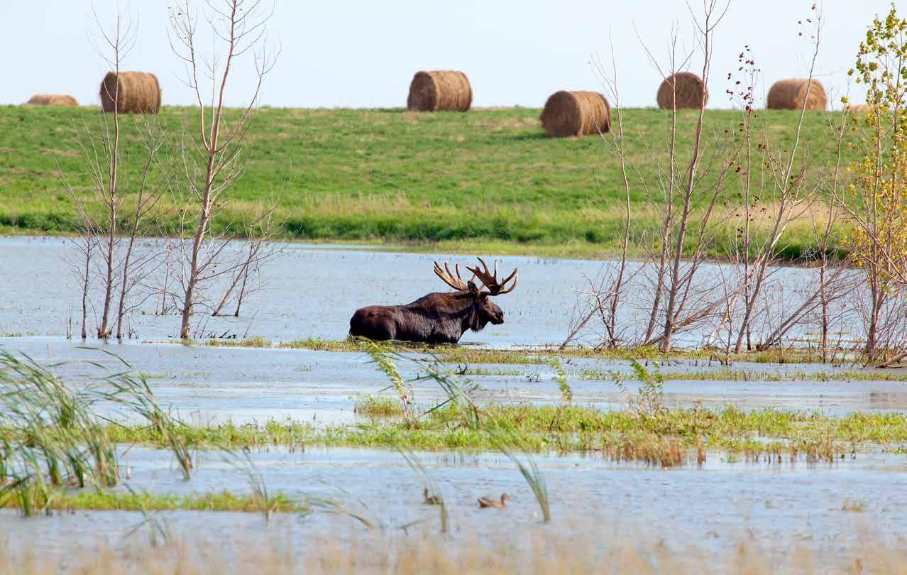 A lone moose wades in the water of reclaimed land northwest of Beulah, North Dakota. This landscape, once mined for fuel, has now been restored to its natural state.