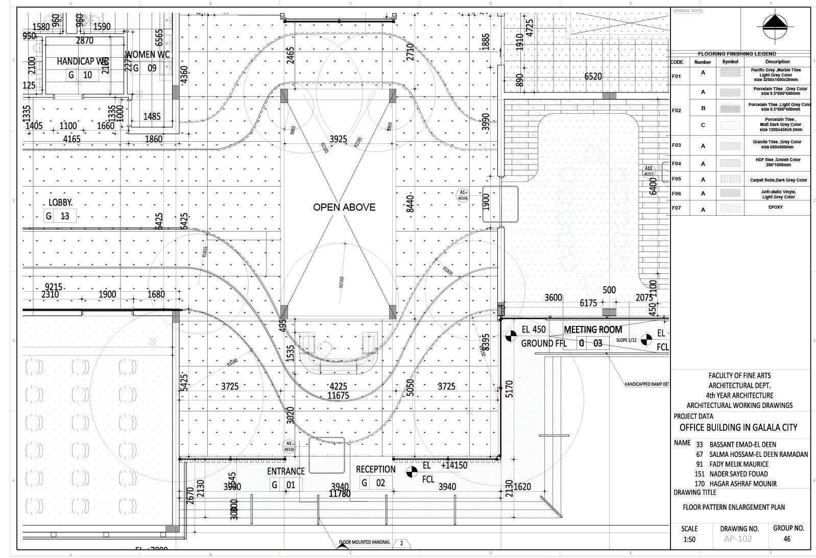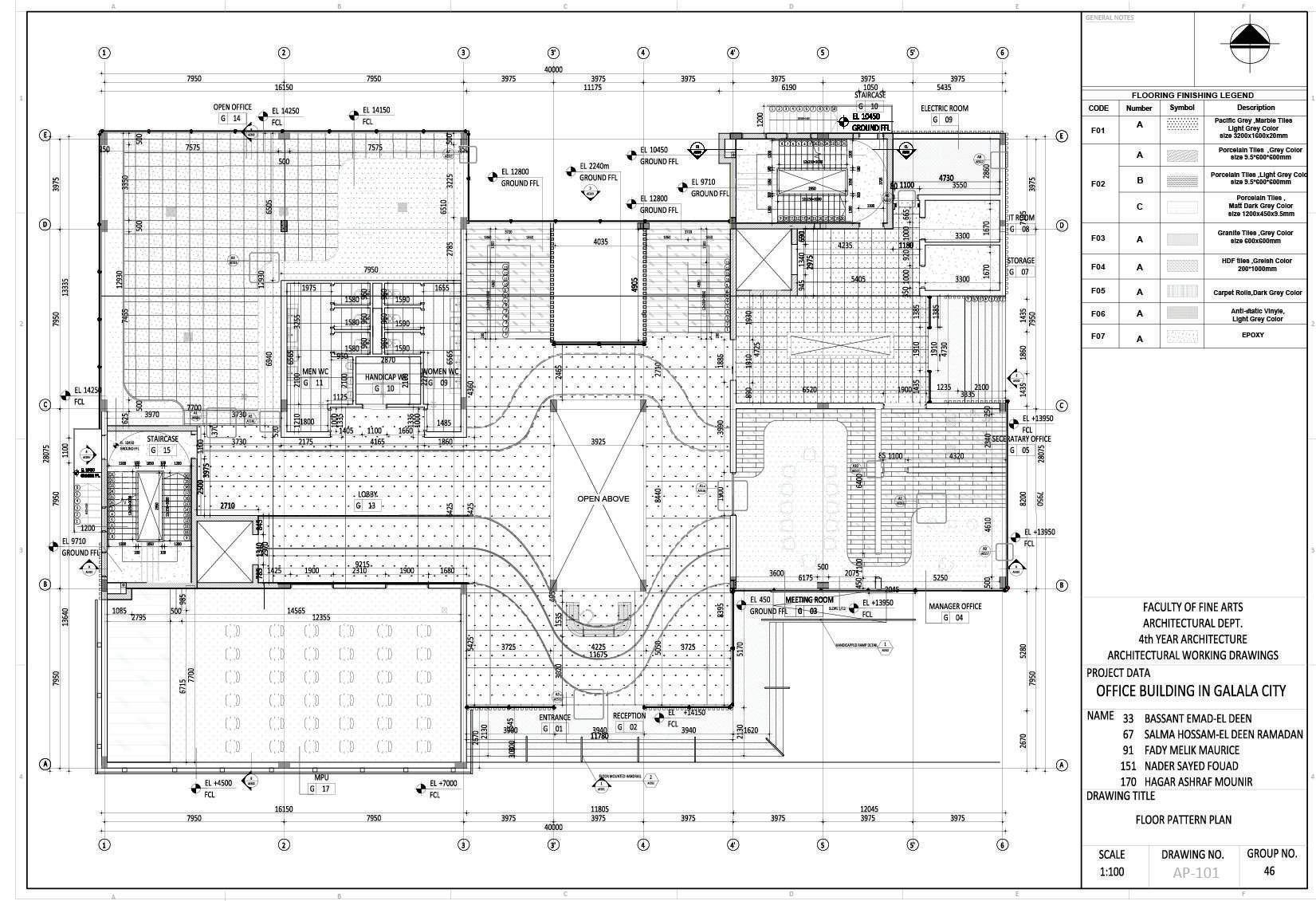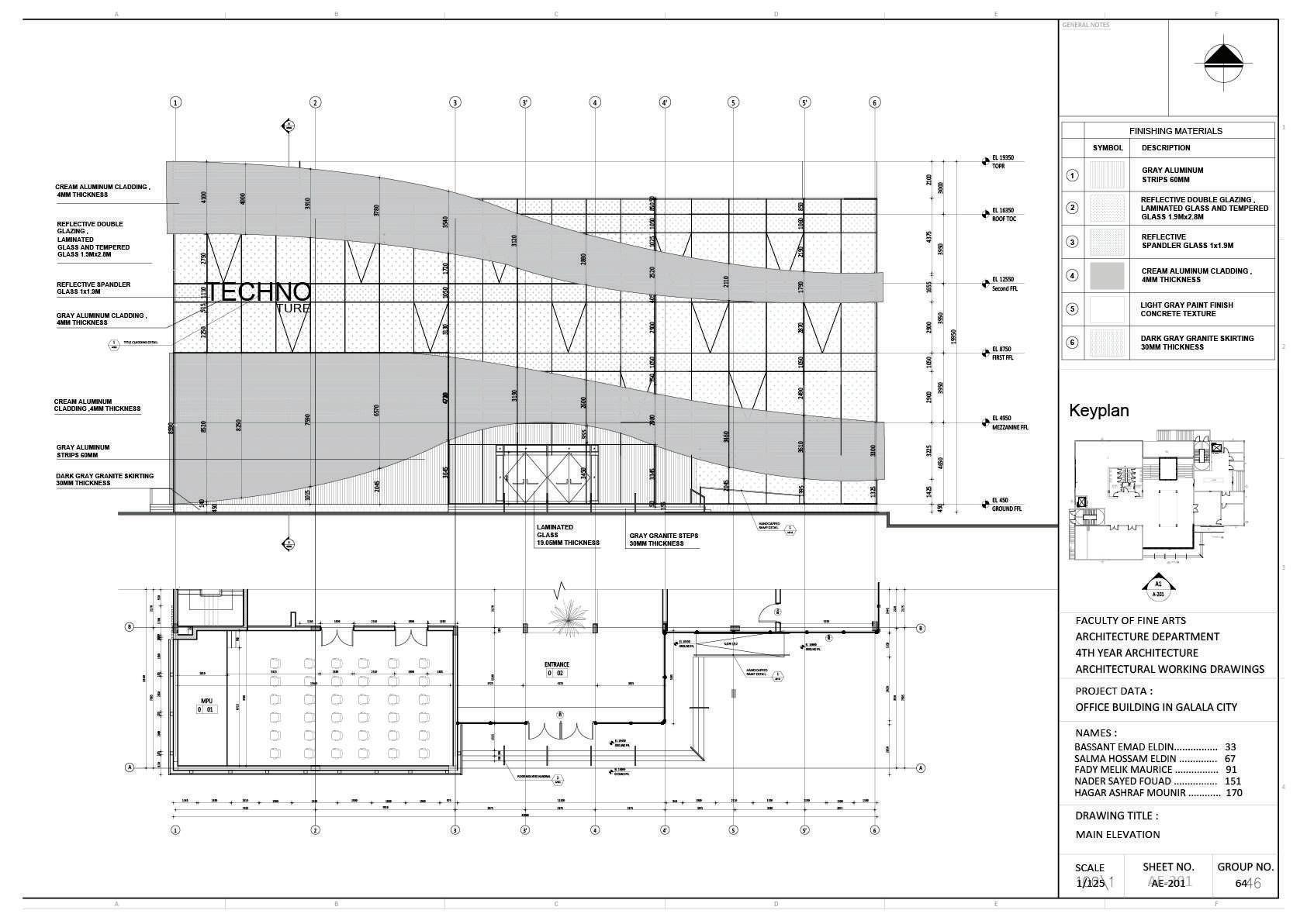 GRAY PLASTER PAINT FINISHING MATERIALS DESCRIPTION SYMBOL AX-101 D E F GENERAL NOTES D E F 2 1 3 4 FACULTY OF FINE ARTS ARCHITECTURAL DEPT. 4th YEAR ARCHITECTURE ARCHITECTURAL WORKING DRAWINGS 33 BASSANT EMAD-EL DEEN 67 SALMA HOSSAM-EL DEEN RAMADAN 91 FADY MELIK MAURICE 151 170 NADER SAYED FOUAD HAGAR ASHRAF MOUNIR NAME DRAWING TITLE PROJECT DATA SCALE DRAWING NO. GROUP NO. OFFICE BUILDING IN GALALA CITY 46 INTERNAL ELEVATIONS Keyplan