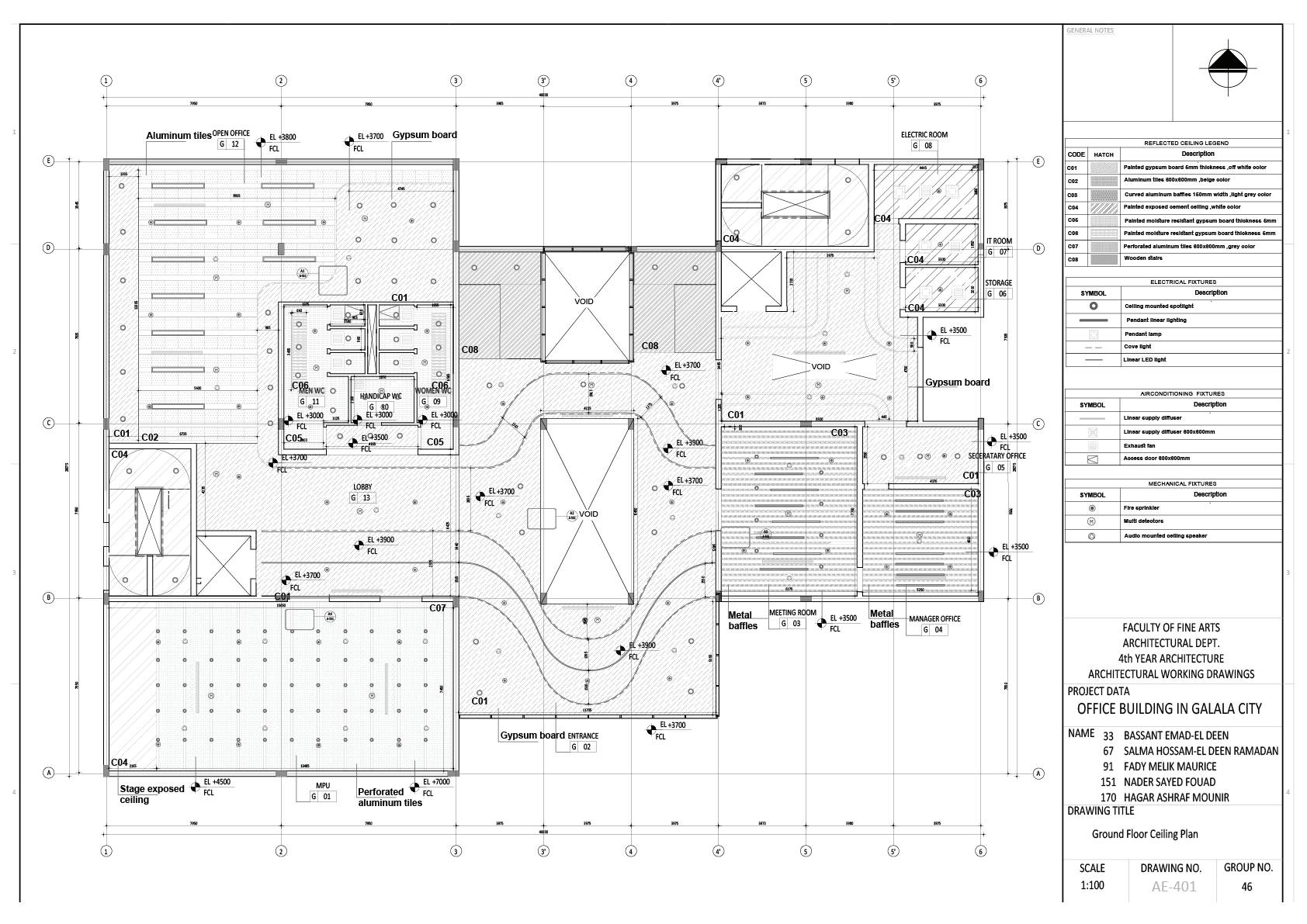 ENTRANCE painted moisture resistant gypsum board MPU wooden tiles MEETING ROOM ALUMINUM CURVED BAFFLE STRIPS OPEN OFFICES galvanized metal strips REFLECTED CEILING GROUND FLOOR PLAN