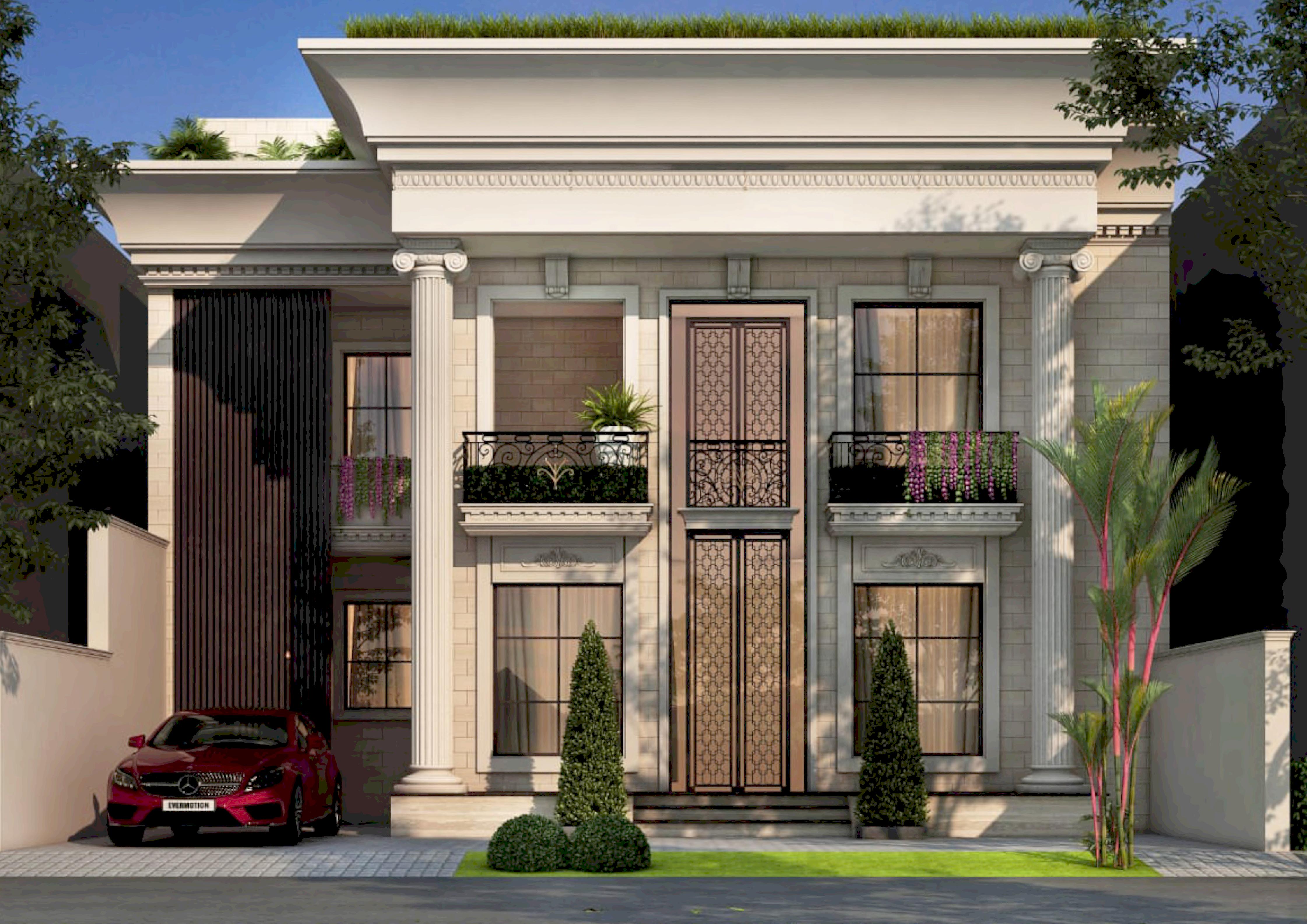 This Classical WDesign, measuring 30 x 45 feet, embraces elegance. Neutral shades are used on the exterior and wrought iron for the railing. The client requested a classical design, and we fulfilled his exact vision for his dream house. The designs are fully practical on the site. Open plan concept was incorporated into this Beautiful Classical- style Villa.