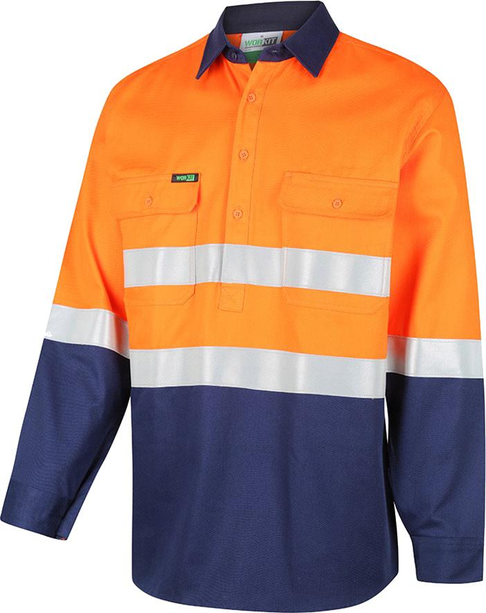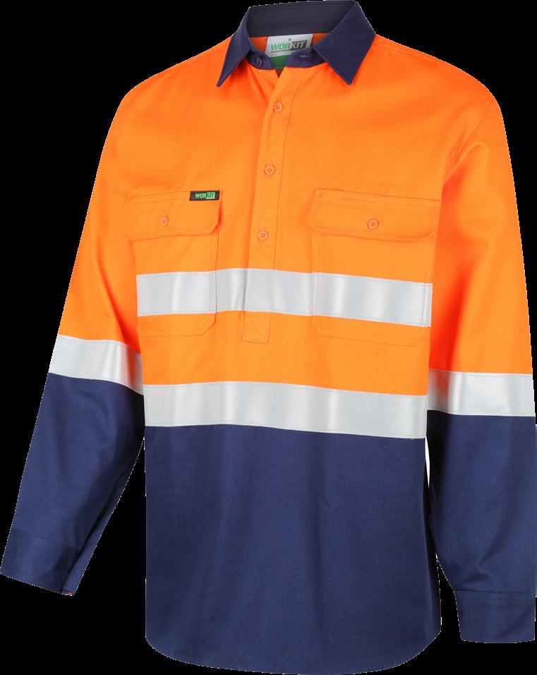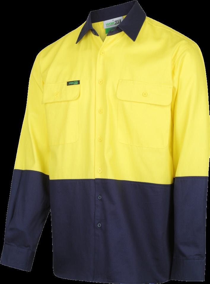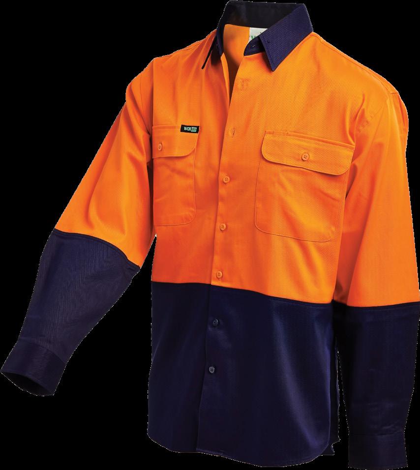 COLOURS: TAPE: FABRIC: S - 6XL Orange/Navy, Yellow/Navy No tape 100% Cotton preshrunk drill 310gsm 100% Cotton preshrunk drill 155gsm 100% Cotton mesh ventilation 2027 HI-VIS 2 TONE CLOSED FRONT DUAL WEIGHT WELDERS TAPED SHIRT