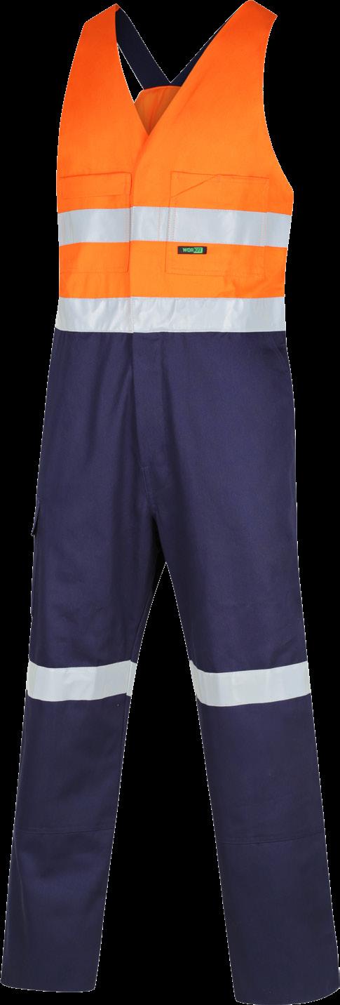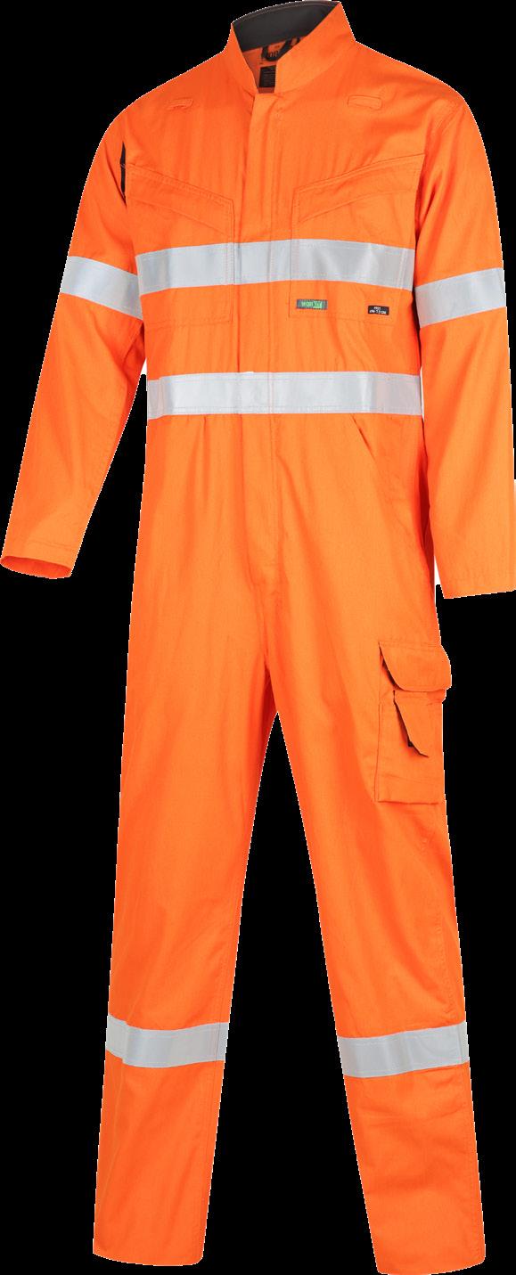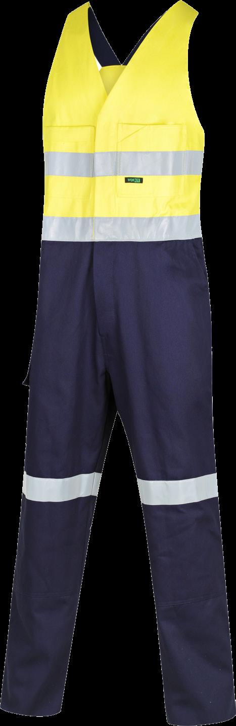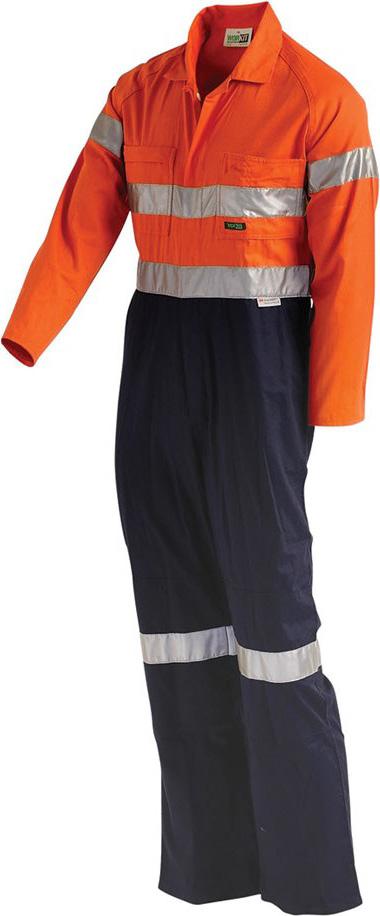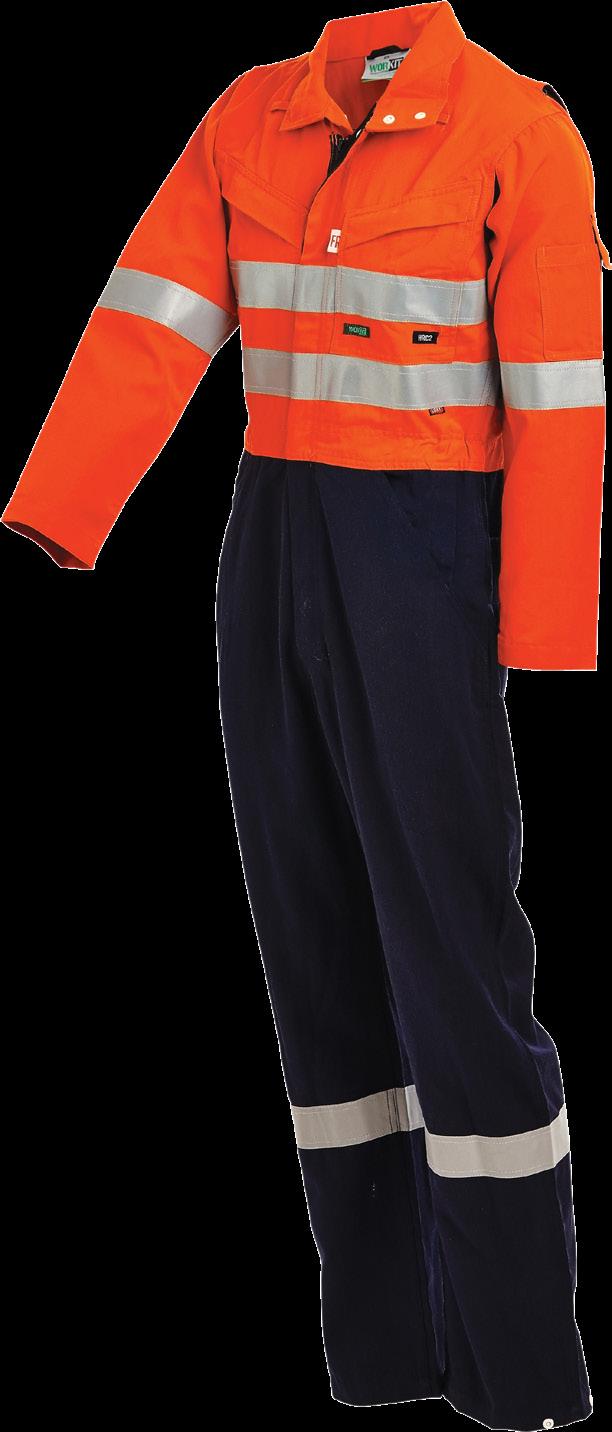 Reflective tape - hoop pattern. SIZES: COLOURS: TAPE: FABRIC: XS - 6XL Orange/Navy, Yellow/Navy Hoop 100% Cotton preshrunk drill 190gsm