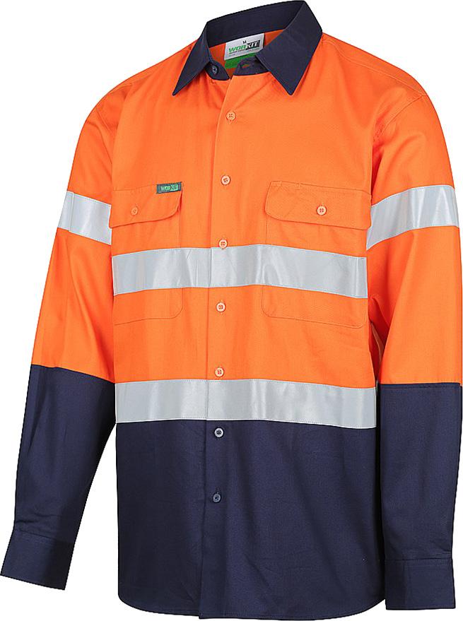 Reflective tape - hoop pattern. SIZES: COLOURS: TAPE: FABRIC: XXS - 6XL Orange/Navy, Yellow/Navy Hoop 100% Cotton preshrunk drill 190gsm HI-VIS 2 TONE REGULAR WEIGHT SHIRT