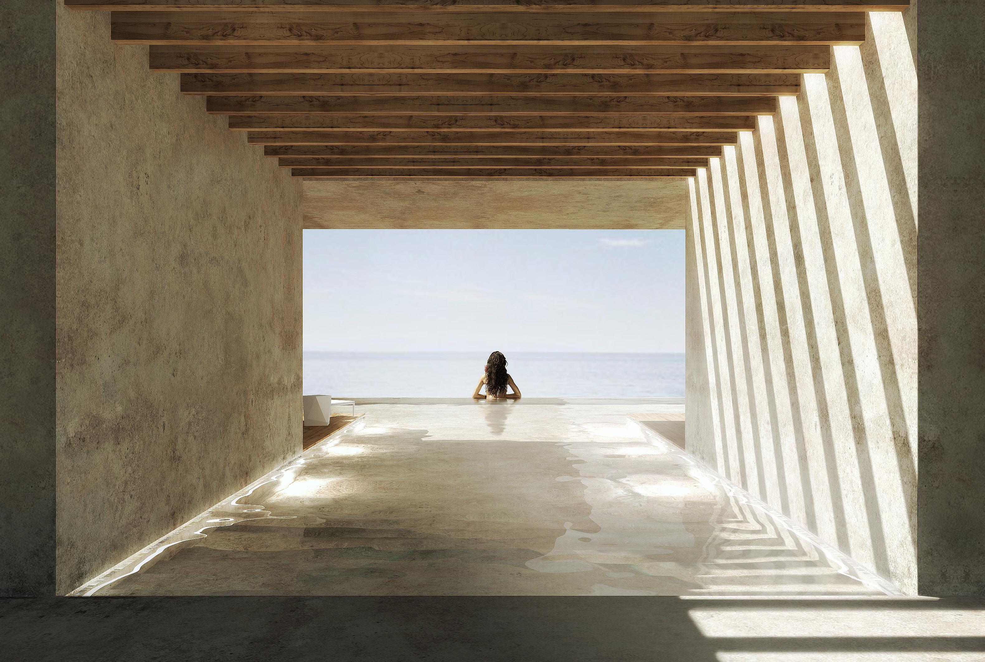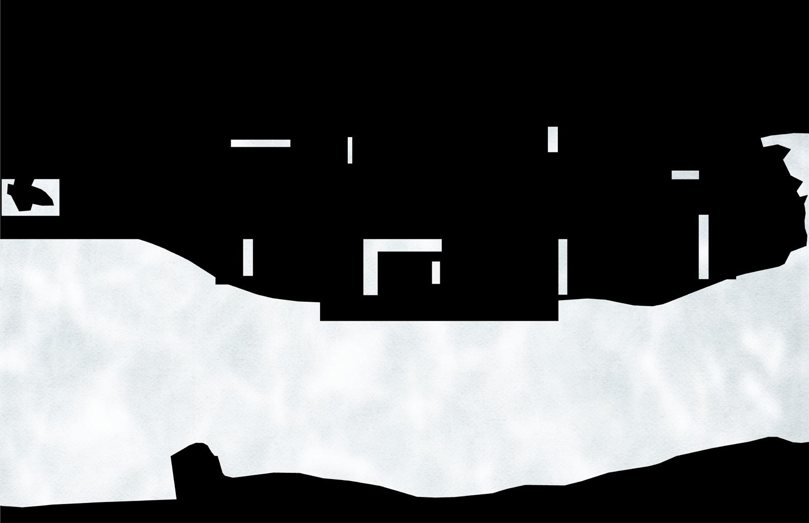 L’idée de fractionnement du projet permet également d’offrir aux utilisateurs des séquences diverses sur l’eau, les falaises et le paysage. Les différentes entités sont connectées par un grand volume central ouvert sur le paysage qui traverse le projet. La promenade extérieure, qui se construit entre deux ruines, se fait sur la toiture de celui-ci et permet de parcourir le site et le projet dans sa totalité. Elle est ponctuée par des séquences qui organisent des moments et des lieux où des évènements se déroulent. Le projet est ainsi pensé comme une promenade en dialogue permanent avec le paysage.