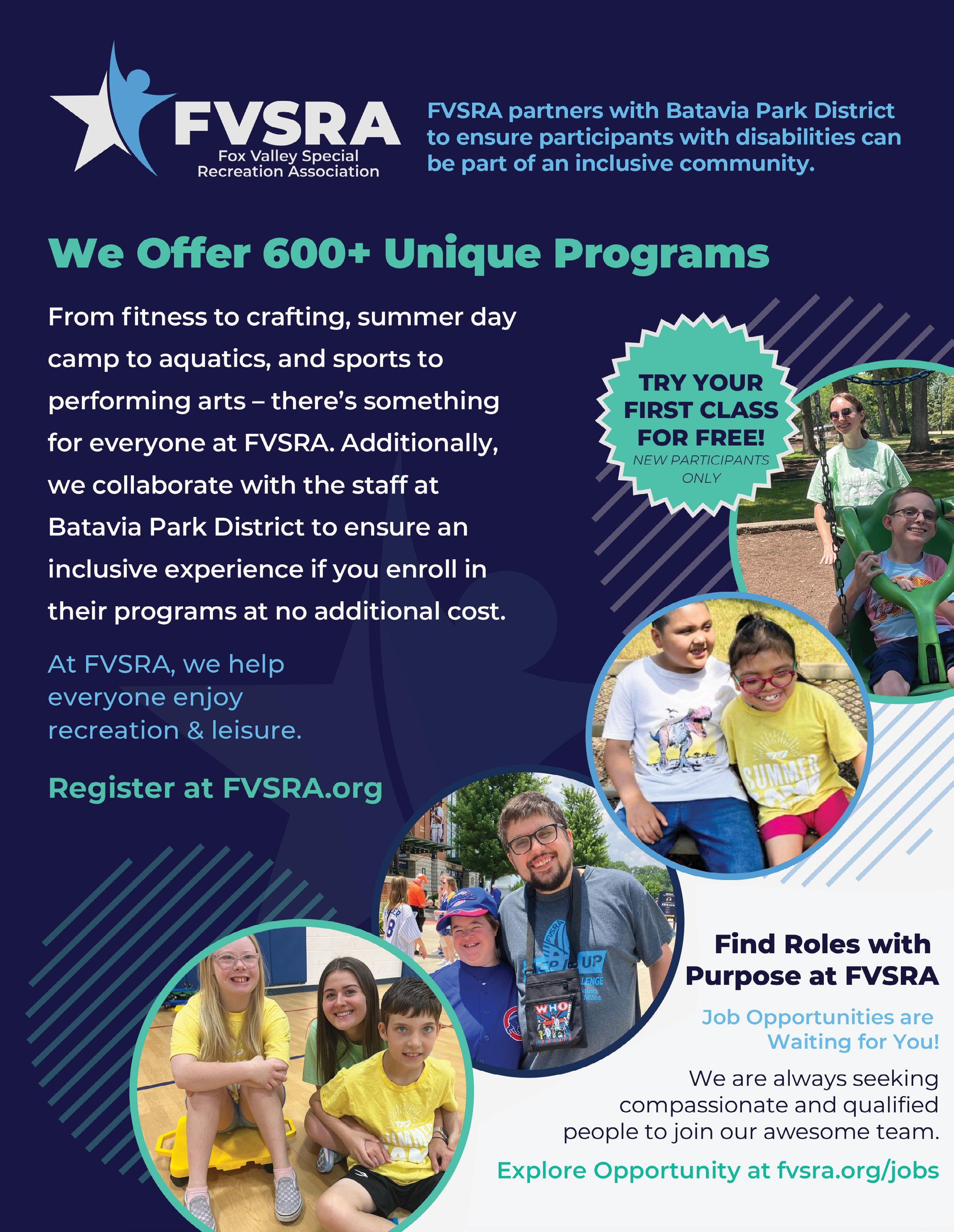 Batavia Park District works collaboratively with the Fox Valley Special Recreation Association (FVSRA) to provide reasonable modifications for individuals with disabilities who need assistance to participate successfully in programs.