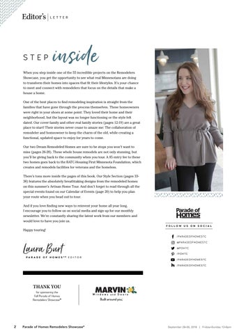 When you step inside one of the 55 incredible projects on the Remodelers Showcase, you get the opportunity to see what real Minnesotans are doing to transform their homes into spaces that fit their lifestyles. It’s your chance to meet and connect with remodelers that focus on the details that make a house a home. One of the best places to find remodeling inspiration is straight from the families that have gone through the process themselves. These homeowners were right in your shoes at some point: They loved their home and their neighborhood, but the layout was no longer functioning or the style felt dated. Our cover family and other real family stories (pages 12-19) are a great place to start! Their stories never cease to amaze me: The collaboration of remodeler and homeowner to keep the charm of the old, while creating a functional, updated space to enjoy for years to come. Our two Dream Remodeled Homes are sure to be stops you won’t want to miss (pages 26-28). These whole house remodels are not only stunning, but you’ll be giving back to the community when you tour. A $5 entry fee to these two homes goes back to the BATC-Housing First Minnesota Foundation, which creates and remodels facilities for veterans and the homeless. There’s tons more inside the pages of this book. Our Style Section (pages 3338) features the absolutely breathtaking designs from the remodeled homes on this summer’s Artisan Home Tour. And don’t forget to read through all the special events found on our Calendar of Events (page 20) to help you plan your route when you head out to tour. And if you love finding new ways to reinvent your home all year long, I encourage you to follow us on social media and sign up for our monthly newsletter. We’re constantly sharing the latest work from our members and would love to have you join us. FOLLOW US ON SOCIAL