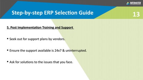 Step-by-step ERP Selection Guide 5. Post Implementation Training and Support Seek out for support plans by vendors. Ensure the support available is 24x7 & uninterrupted. Ask for solutions to the issues that you face.