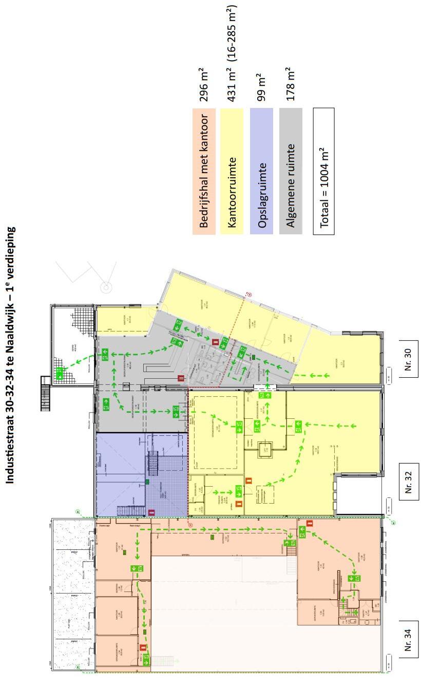 Via een doorgang van huisnummer 32 naar 34 is de bedrijfshal bereikbaar. De bedrijfshal is met een vrije hoogte tot 5,40 meter en een elektrische overheaddeur van 4x4m uitstekend te gebruiken voor opslag- en productiedoeleinden. In de bedrijfshal zijn eveneens loodskantoren, entresolvloeren en afsluitbare magazijnen ingebracht, waarmee zowel op de begane grond als de verdieping ruim voldoende opslagmogelijkheden zijn.