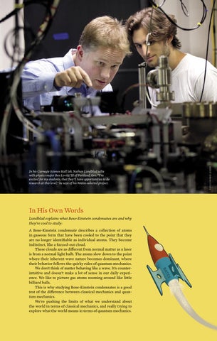 In His Own Words Lundblad explains what Bose-Einstein condensates are and why they’re cool to study: A Bose-Einstein condensate describes a collection of atoms in gaseous form that have been cooled to the point that they are no longer identifiable as individual atoms. They become indistinct, like a fuzzed-out cloud. These clouds are as different from normal matter as a laser is from a normal light bulb. The atoms slow down to the point where their inherent wave nature becomes dominant, where their behavior follows the quirky rules of quantum mechanics. We don’t think of matter behaving like a wave. It’s counterintuitive and doesn’t make a lot of sense in our daily experience. We like to picture gas atoms zooming around like little billiard balls. This is why studying Bose-Einstein condensates is a good test of the difference between classical mechanics and quantum mechanics. We’re pushing the limits of what we understand about the world in terms of classical mechanics, and really trying to explore what the world means in terms of quantum mechanics.